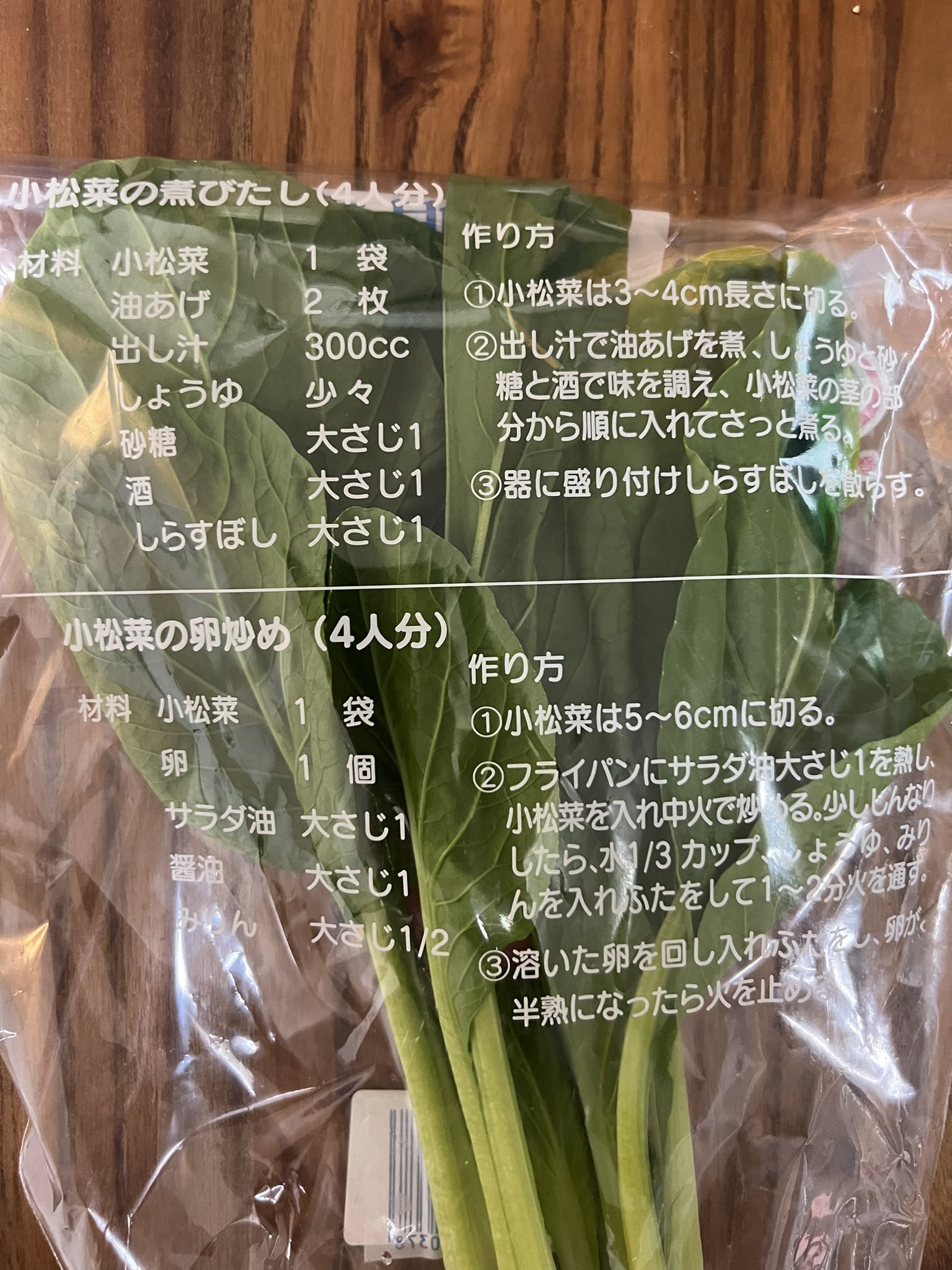 今気づいたんだけど、同じところが出荷してる小松菜は裏にレシピが書いてある…笑(チンゲンサイも書いてくれとかそういう意味ではないです。優しいねって) https://t.co/96h8qPxn8k