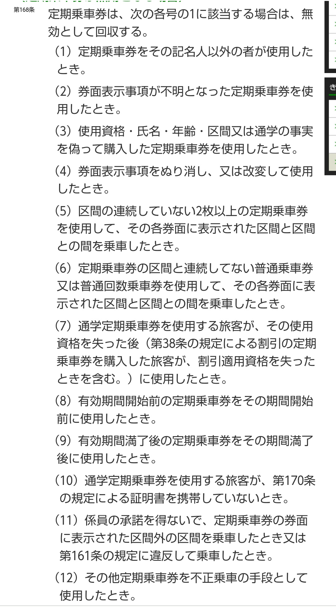 JRのホームページの旅客営業規則にちゃんと書いてあるからな。他人の定期券使った場合、その時点で回収した上で、定期券記載の利用開始日から不正使用した日までの期間、その定期券の区間を毎日1往復したものとして計算した運賃の計3倍の金額を徴収するって。規則、コアな鉄オタしか見てないけど。 https://t.co/HM6PVoUrPp