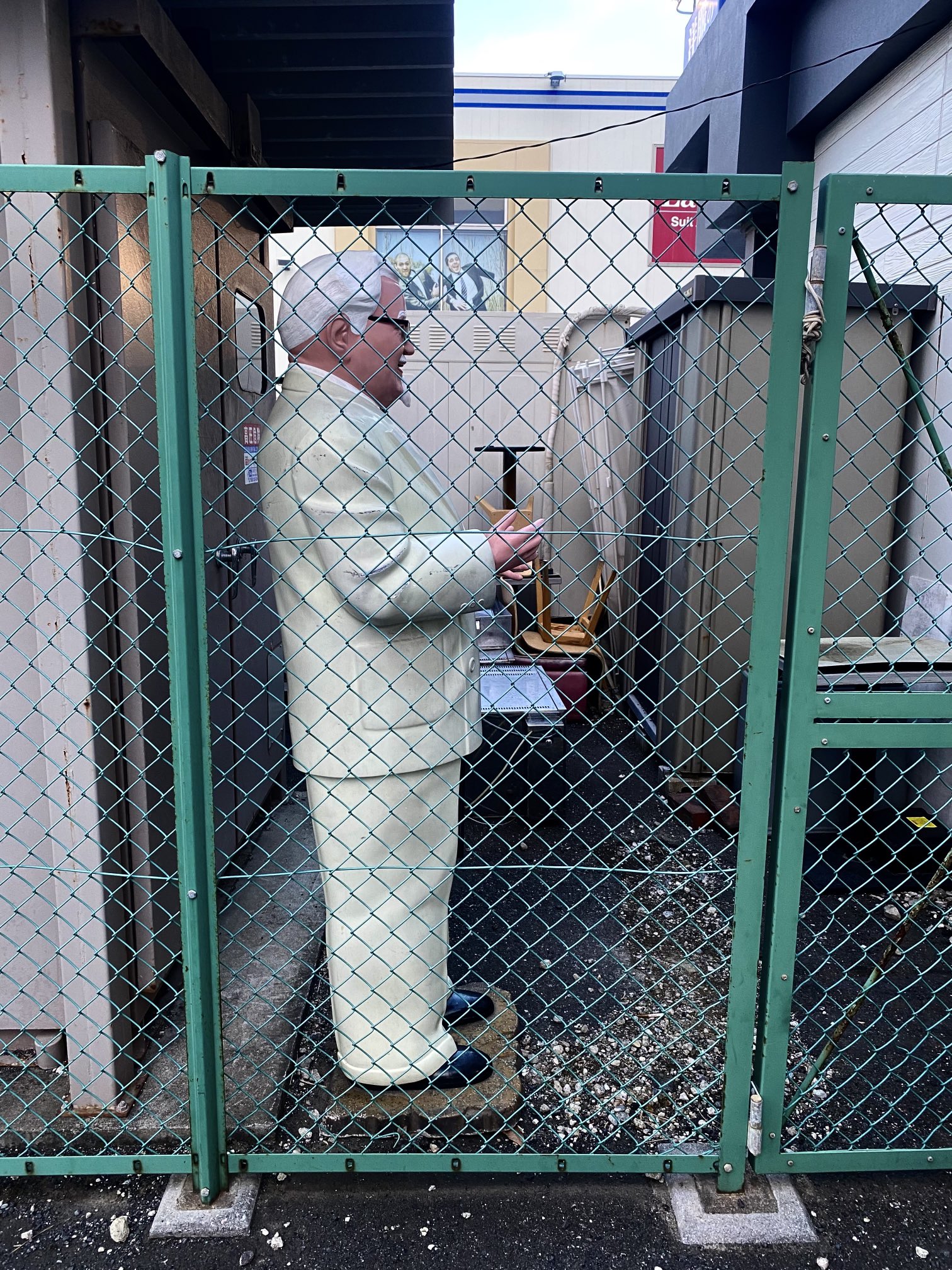 飲食店だし人目のつかないところで一服・・・みたいなカーネルサンダース。