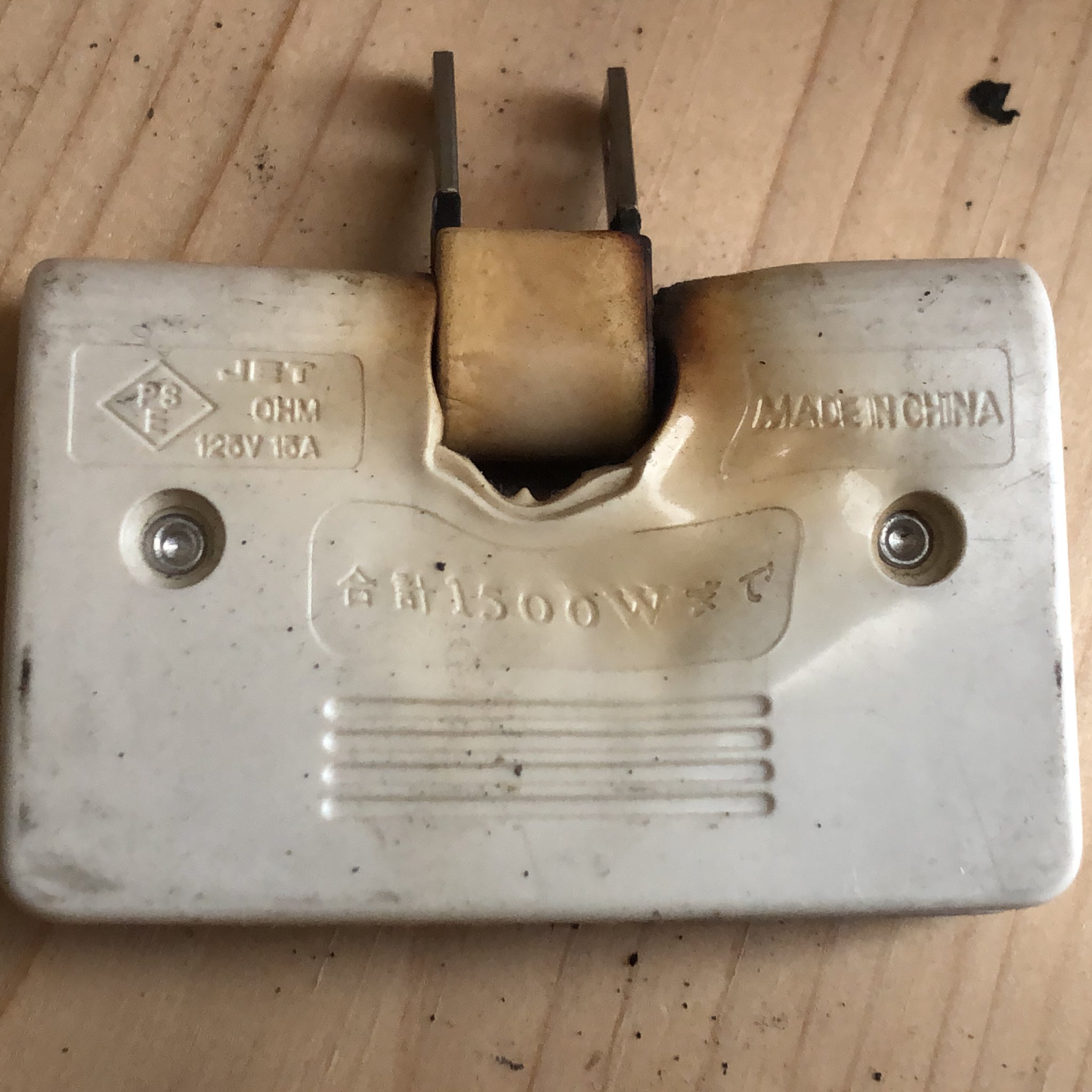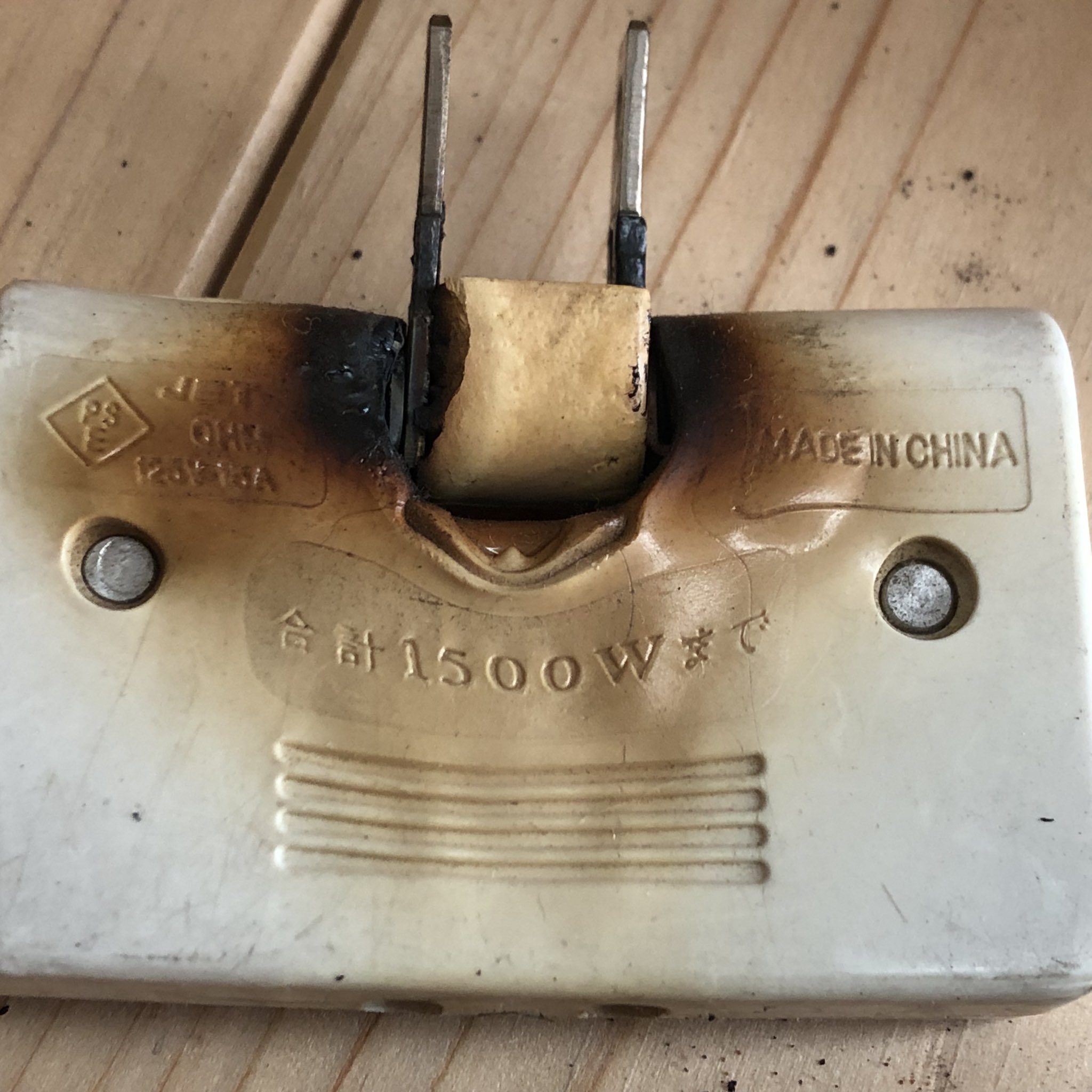 原因はコンセント側の可能性もあるって指摘もあったけど、そうは見えないのよね。。タップの曲がる所が一番燃えてるし、タップはかなり古いと思う。家を改装して年月が経っていないので、コンセントは新しいのよね。