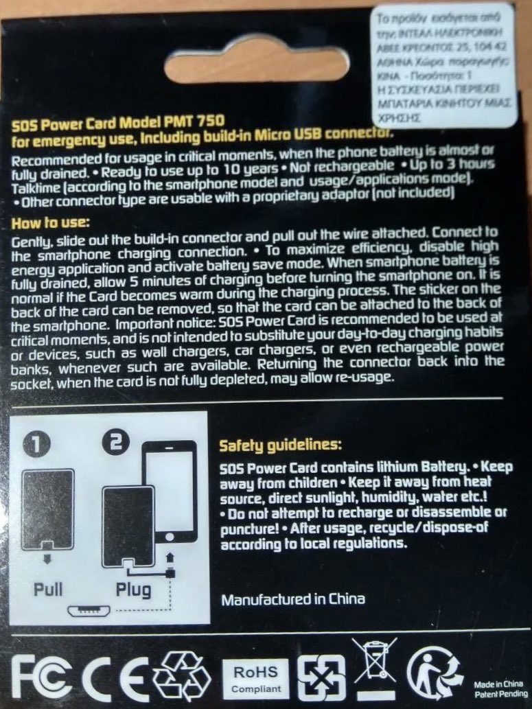 どうやらEnergiger「SOS POWER CARD」って品のアウトレット品かなんからしい。すでに公式サイトに記載がなく、販売終了なのか名前だけ勝手に使ってるパチモンかなんか。パッケージを見るとリチウム一次電池(カメラ用バッテリーとかのやつ)にケーブルを内蔵した製品の模様。 https://t.co/qI8viocOot