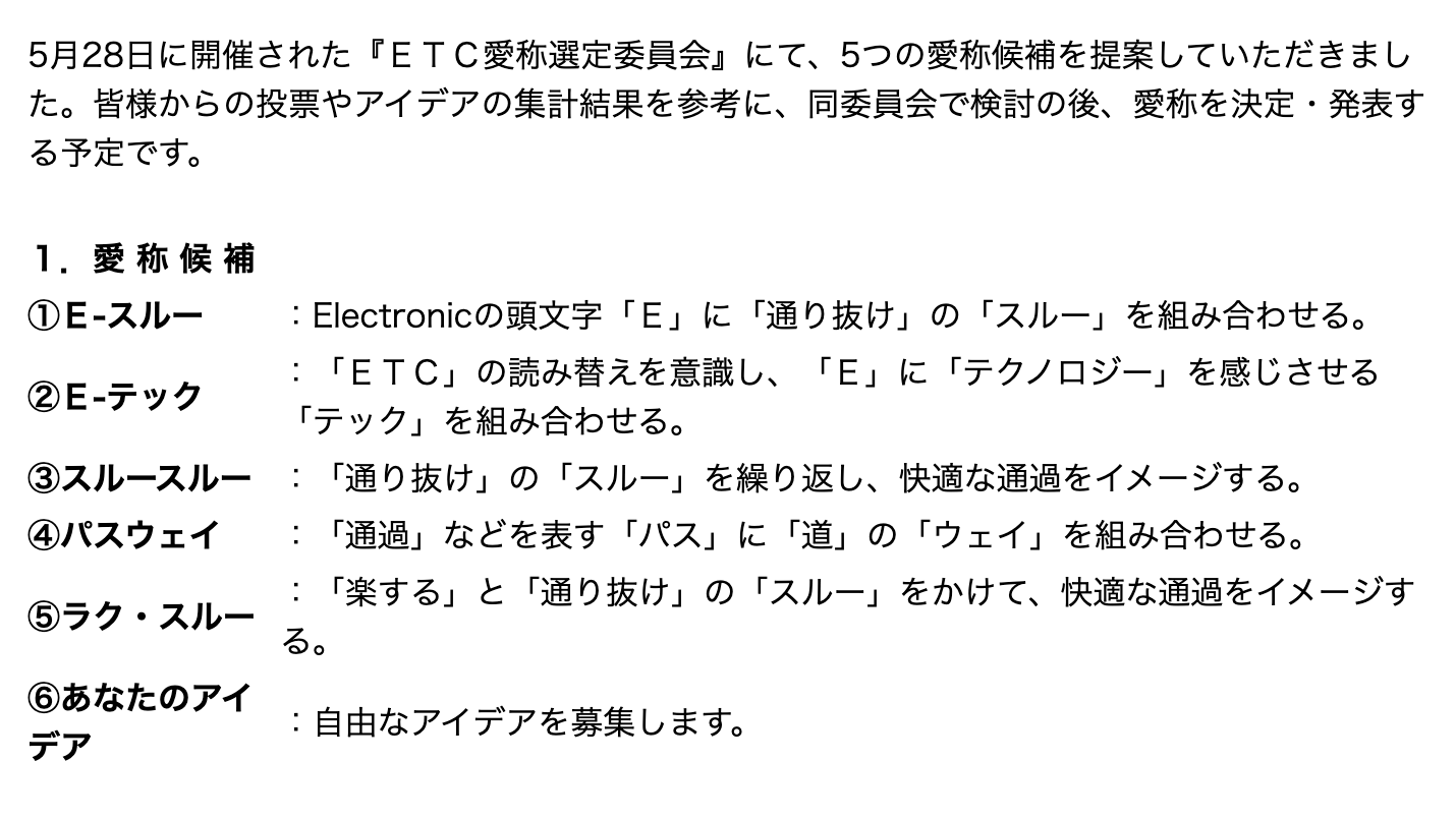 >ETCの一般利用開始に伴い、2001年(平成13年)に国土交通省が主催した「ETC愛称コンテスト」により「イーテック」という愛称が付与された[6]が、ほとんど浸透しなかった。https://t.co/yXQgHW9J6wへー