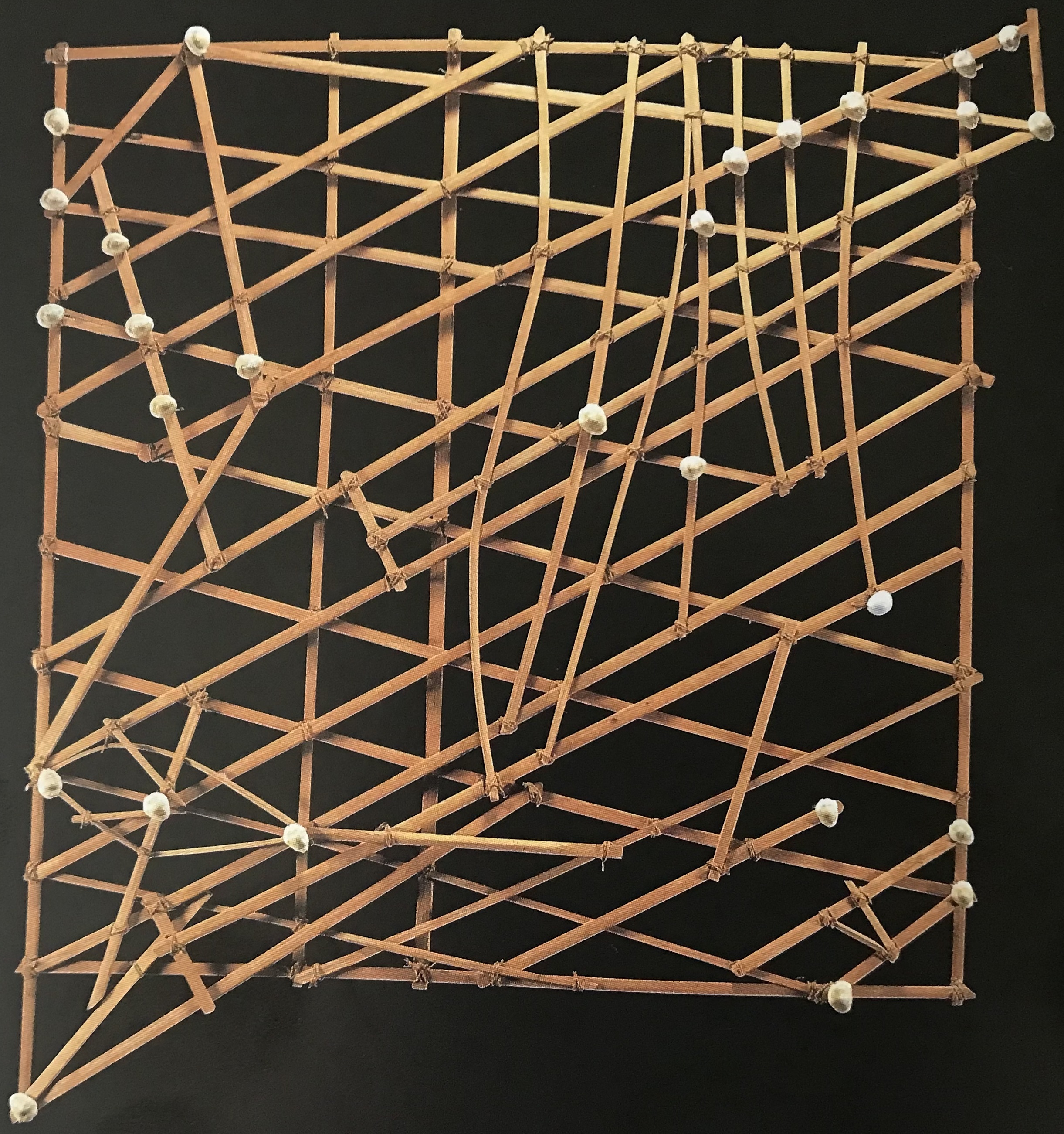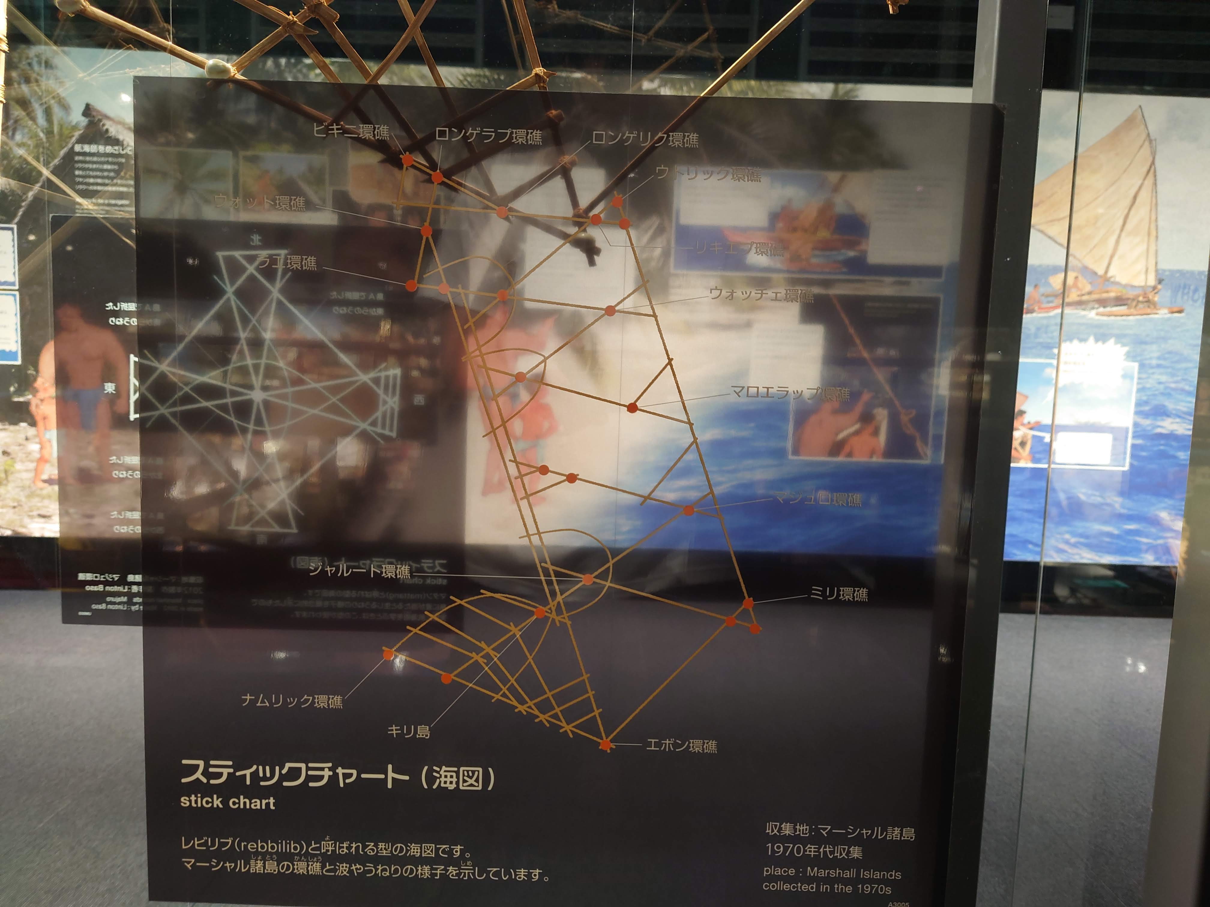 これは民博所蔵の海図で、マーシャル諸島の人たちが使っていたもの。縦横の枝は海流のうねりをあらわしています。ところどころに置かれたタカラガイが島々。若い人に航海術を教えるときに用いられていたのだそうです。