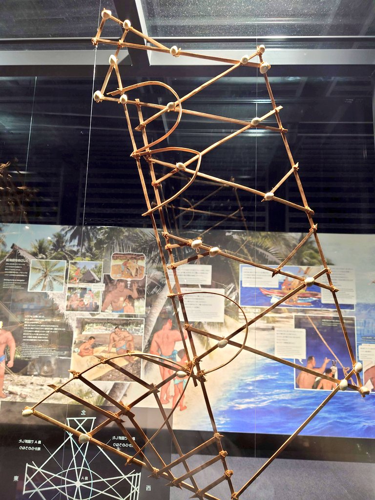 個人的にはプトレマイオス図、混一疆理歴代国都之図に並ぶ世界三大古地図の一つ、スティックチャート😤この石が島々を表し、木の枝で数100km以上の航路を表す、らしい😨