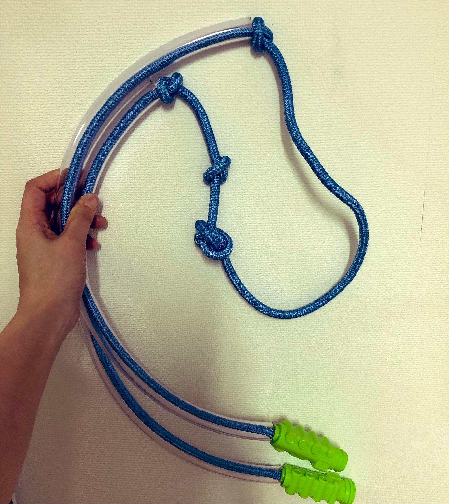 ホースの長さは左右それぞれ50cmのものを左右に通してホースが下がらないように結んで固定してます☺️持ち手が長くなるイメージです!(他の結び目は🪢縄跳びの長さ調整のためなので関係ありません)