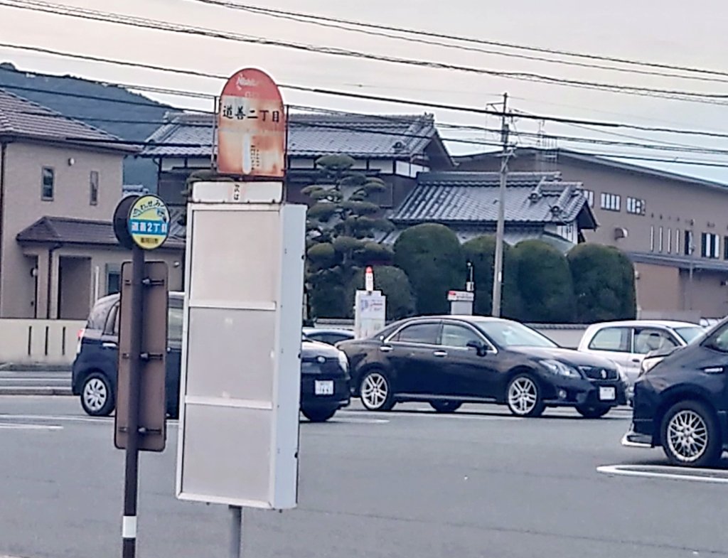 面白いwたぶん目の前の十字路を別方向から来る別系統のために設置したバス停なんだろうなあ
