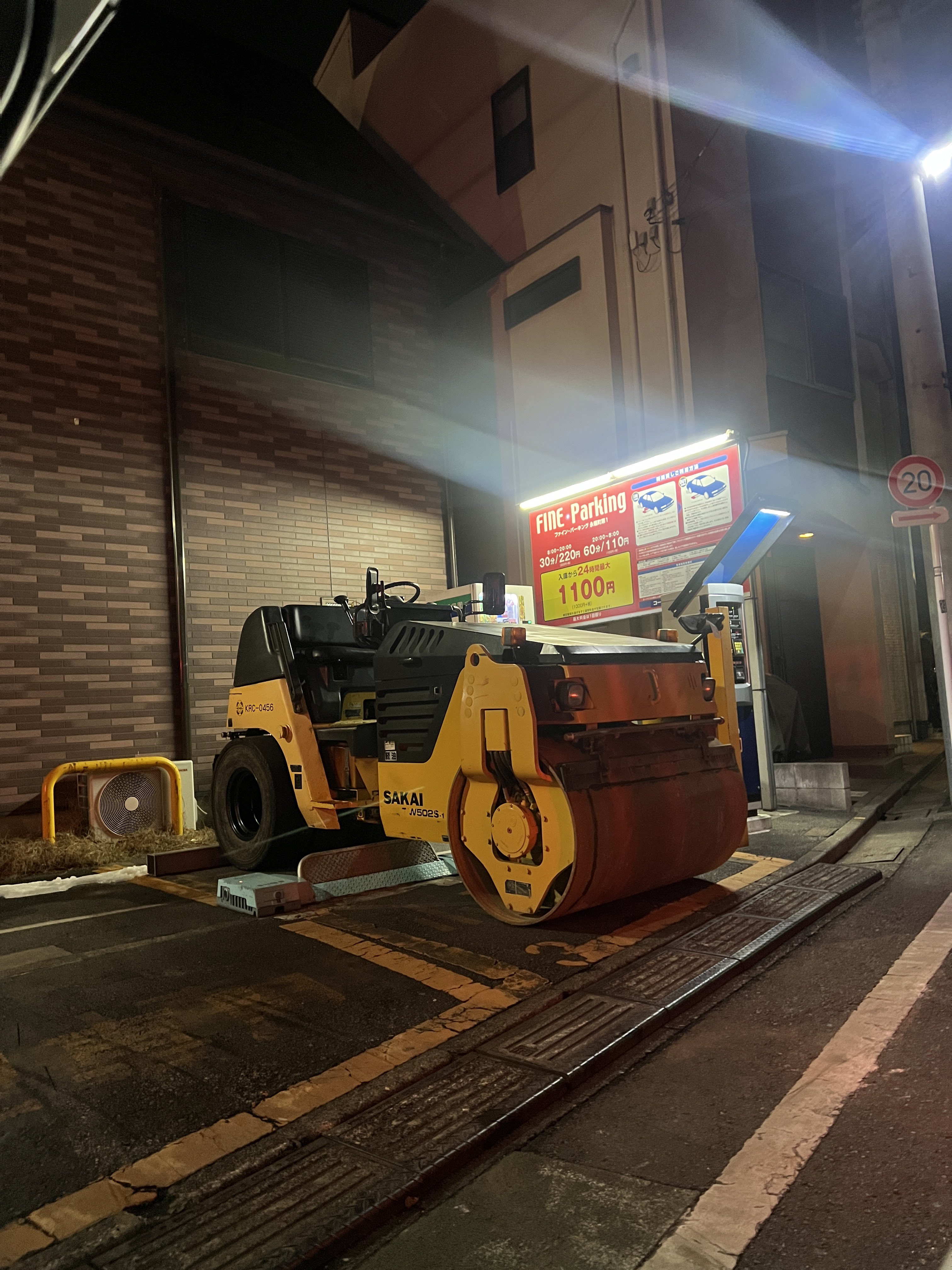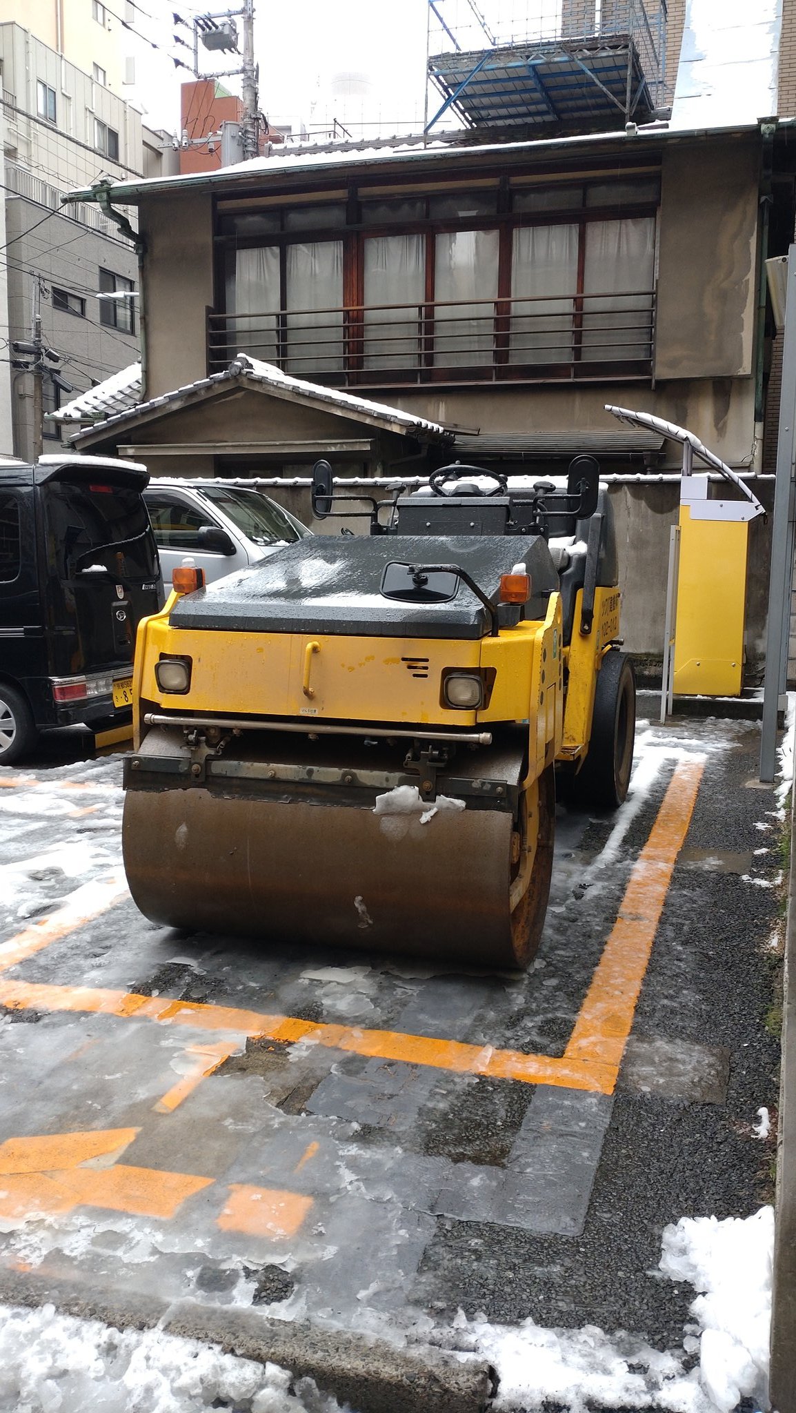 よくあるなんなら舗装屋のアスファルトフィニッシャーや小型ホイールローダーがコインパに駐車してあることも