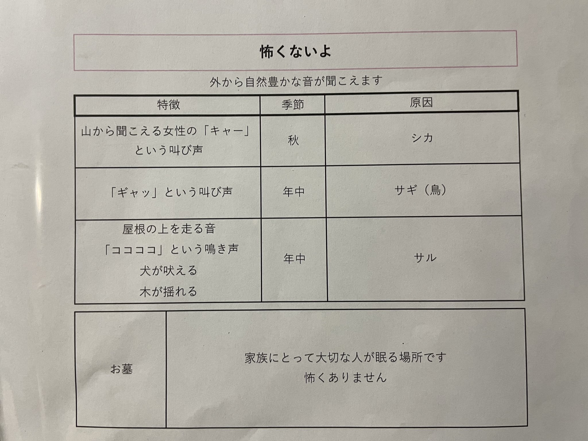 ・男性らしき声で「おーい」と呼んでいる様に聴こえる→クマです逃げてください。がなくて良かったですよい説明、不安解消が出来るのでお寺の方素敵ってなりました