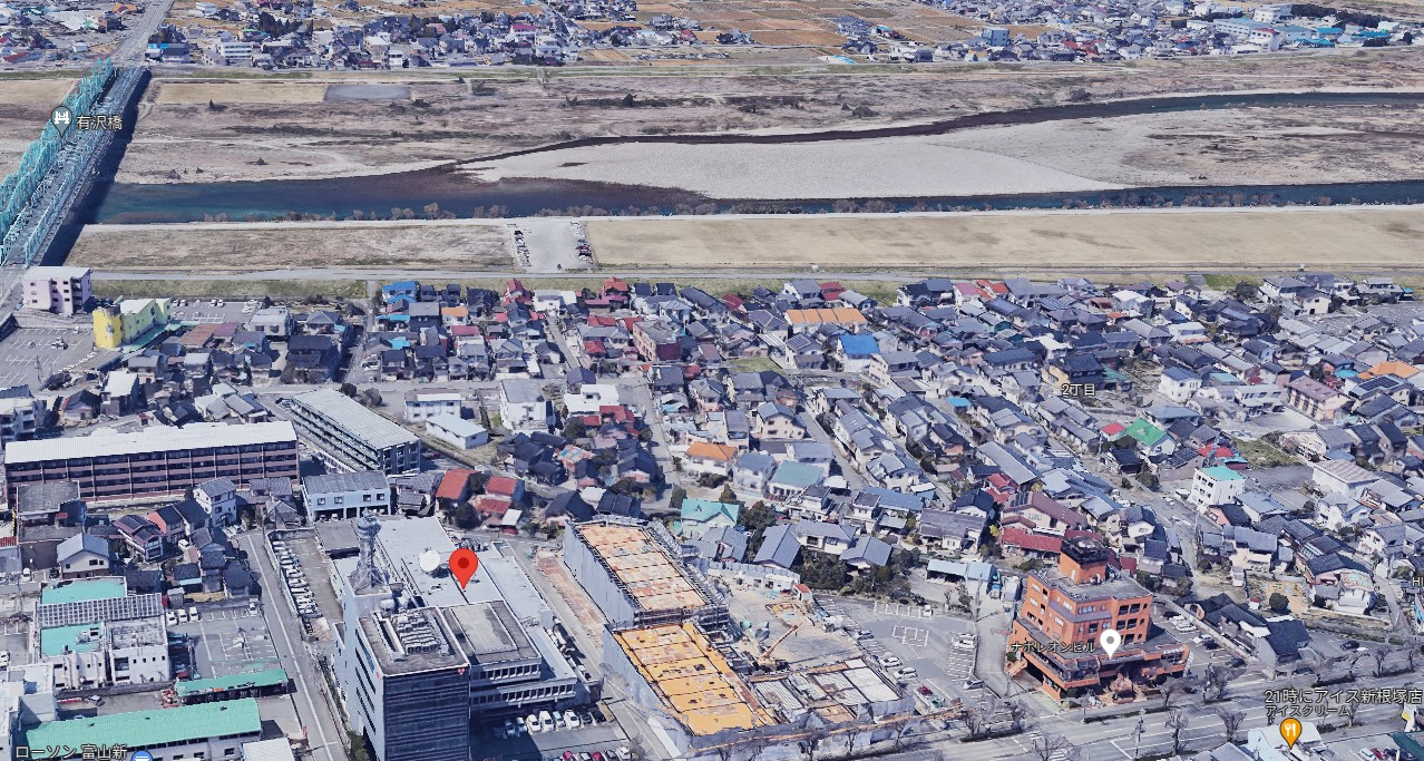 #富山 #花火🎆いま、BBT(富山テレビ)の位置をグーグルマップで見たらこの位置(赤いマーク)。上にあるのが神通川。左に見える橋は有沢橋。どうやら、有沢橋周辺での花火らしいですね。動画を見ても、ちょうど中央が川で反射してますね。 https://t.co/EMcKptvt8t