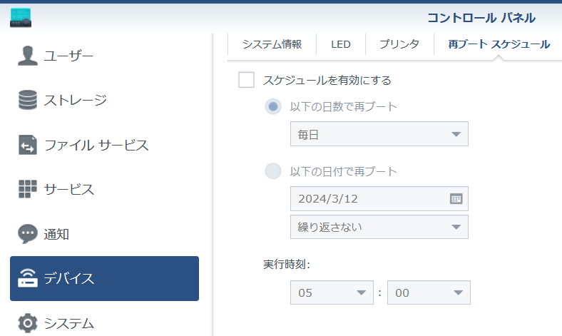 Synology,ASUS,tp-linkなどの海外メーカーのルータは割と再起動スケジュール機能がデフォだったりします。画像はSynologyのルータ「定期的な再起動が必要となるケースもある」と現実に即した設計なのがいいですね。 https://t.co/bhXKVX7syr