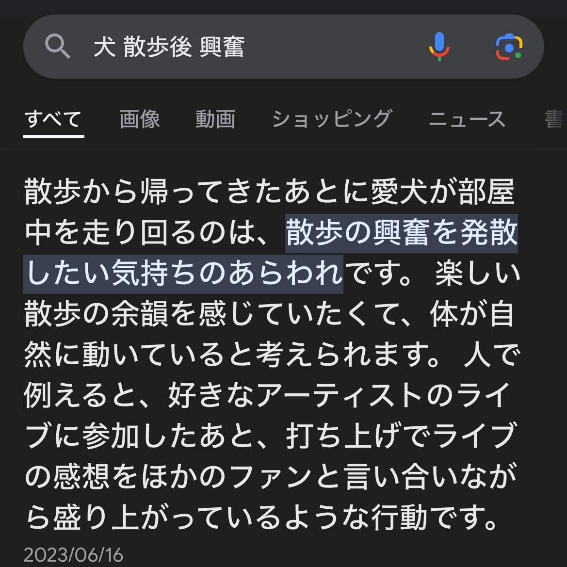 犬散歩行くといつも家の中で暴れ回るから散歩足りてないんかな…と思ってググったらライブ後に他のファンと感想を言い合ってるオタクと同じって書いてあってあれ毎日味わってんのかよって思った https://t.co/7tkziO27VR
