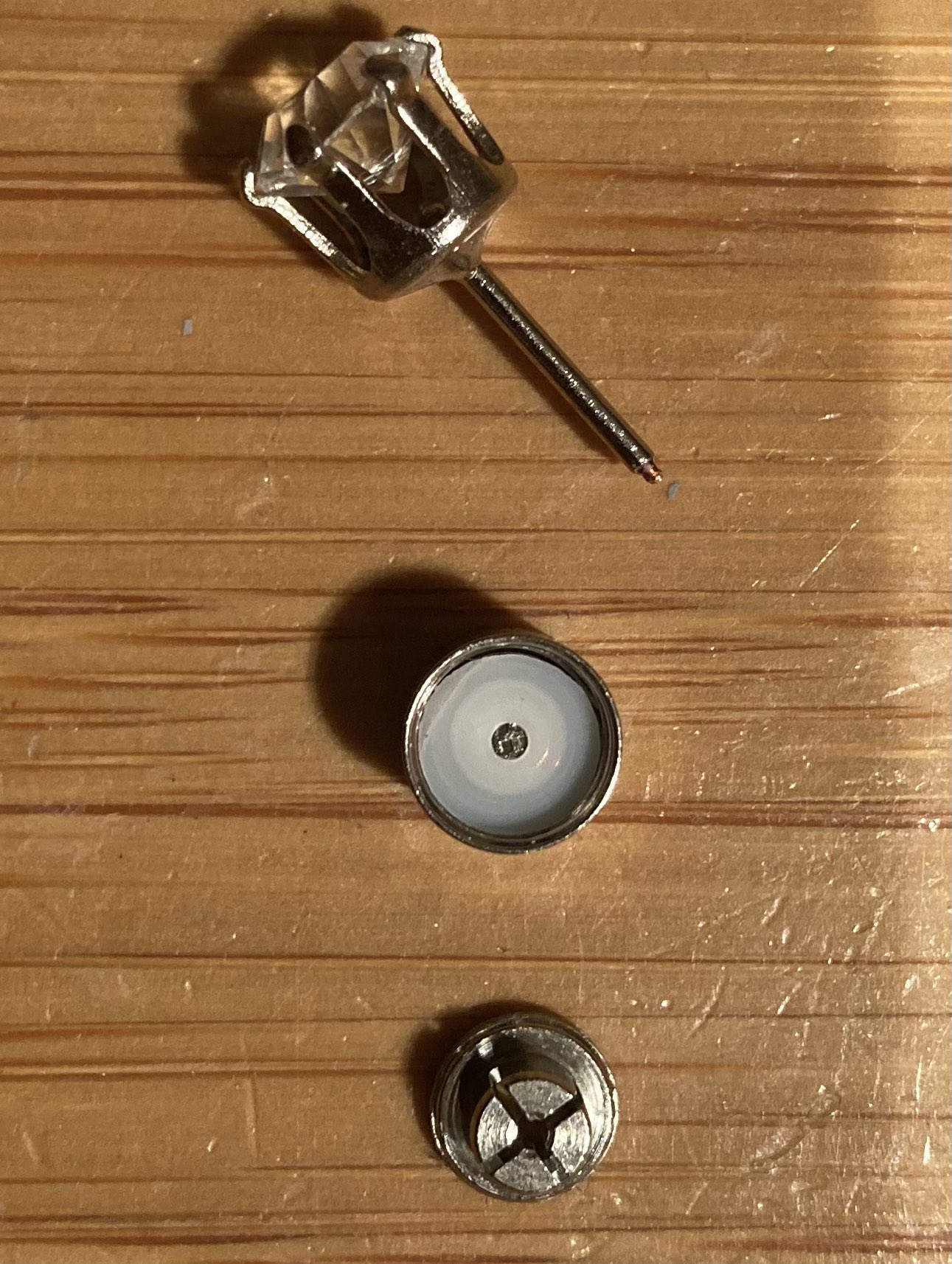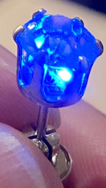 すごい構造。ピアスのポストが同軸ケーブルみたいになってる。宝石の下に小さな基板がありLEDと42Ωチップ抵抗が載ってた。 https://t.co/mGEgOxSzgF