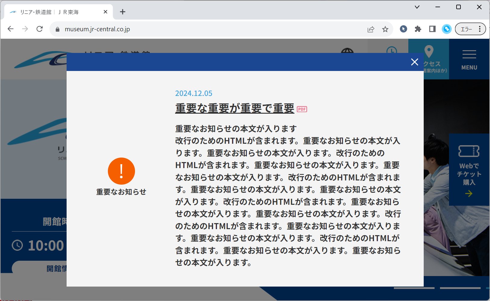 リニア・鉄道館の公式サイトにアクセスしたら、このダイアログはなに?重要な重要が重要で重要 https://t.co/0LjHREmCam