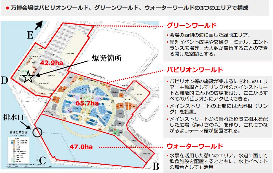 しかも、この真ん中あたりで姿を見せてるパビリオンって概ね、主催者関連のテーマ館なのでは?海外のタイプAパビリオン(下記会場配置図の水色)はどこ?どこなの??(狼狽) https://t.co/6nYoO70BKa