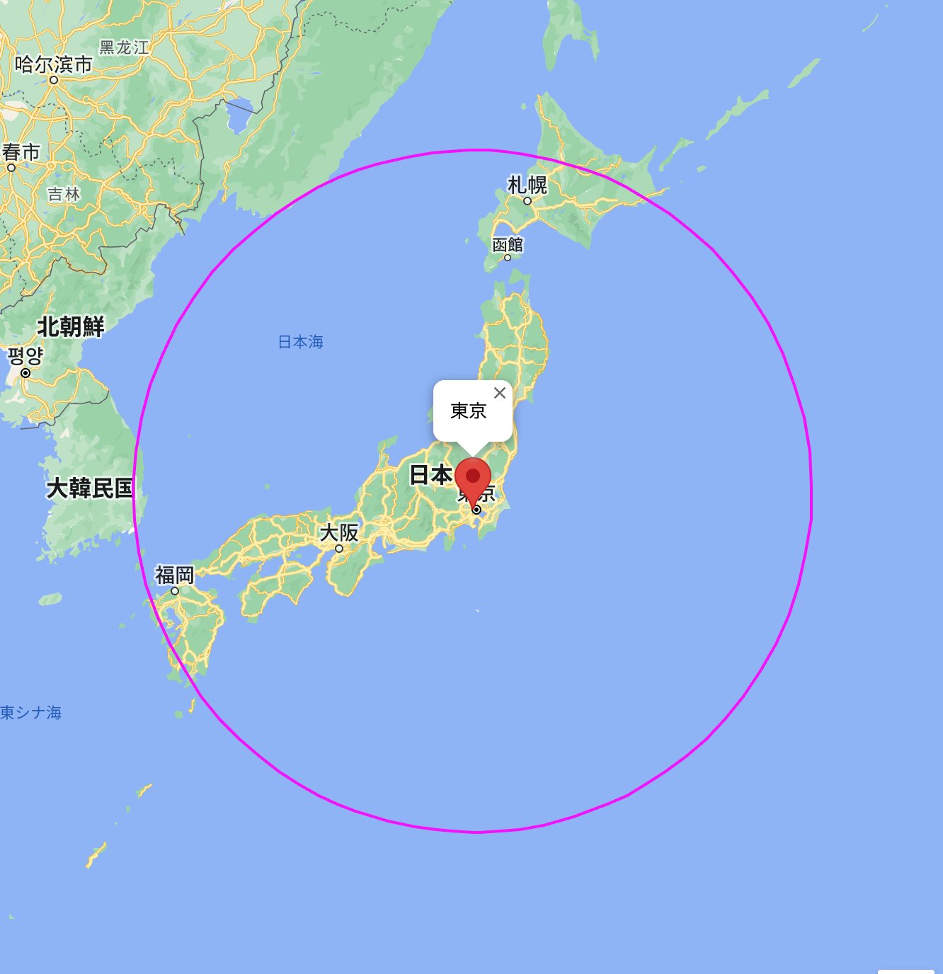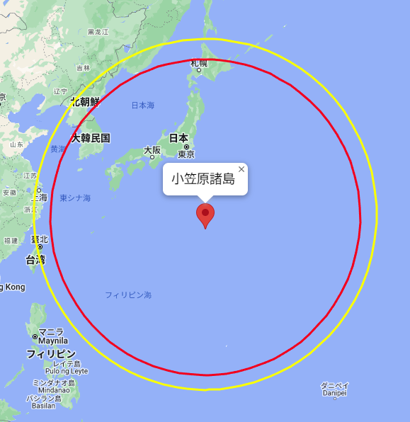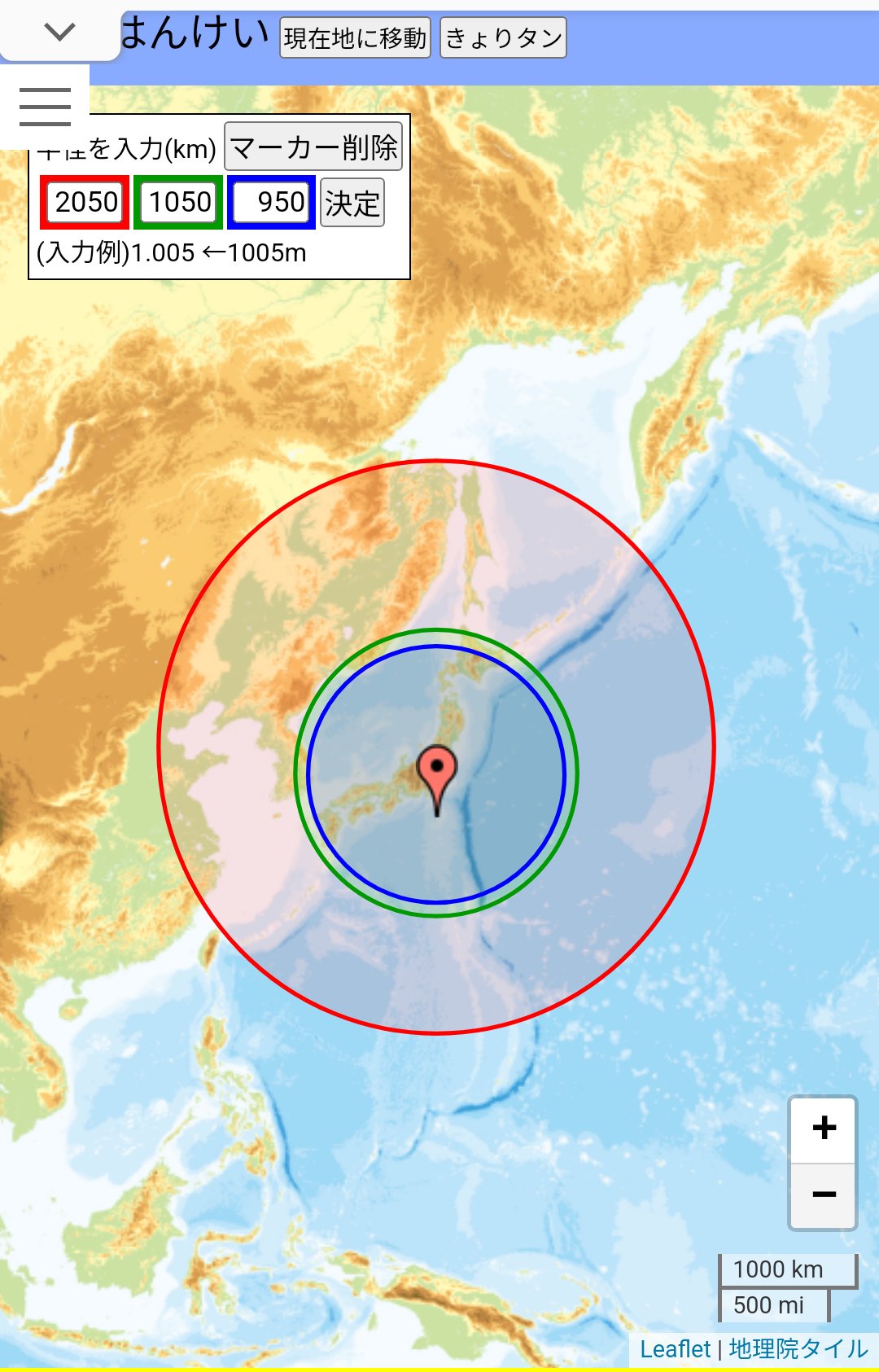 韓国が入るのを少し我慢するなら1050km 沖縄の端までなら2050Kmにすれば良い沖縄入れると韓国、北朝鮮、中国、ロシアまで入るけど https://t.co/CsrtKouXYg