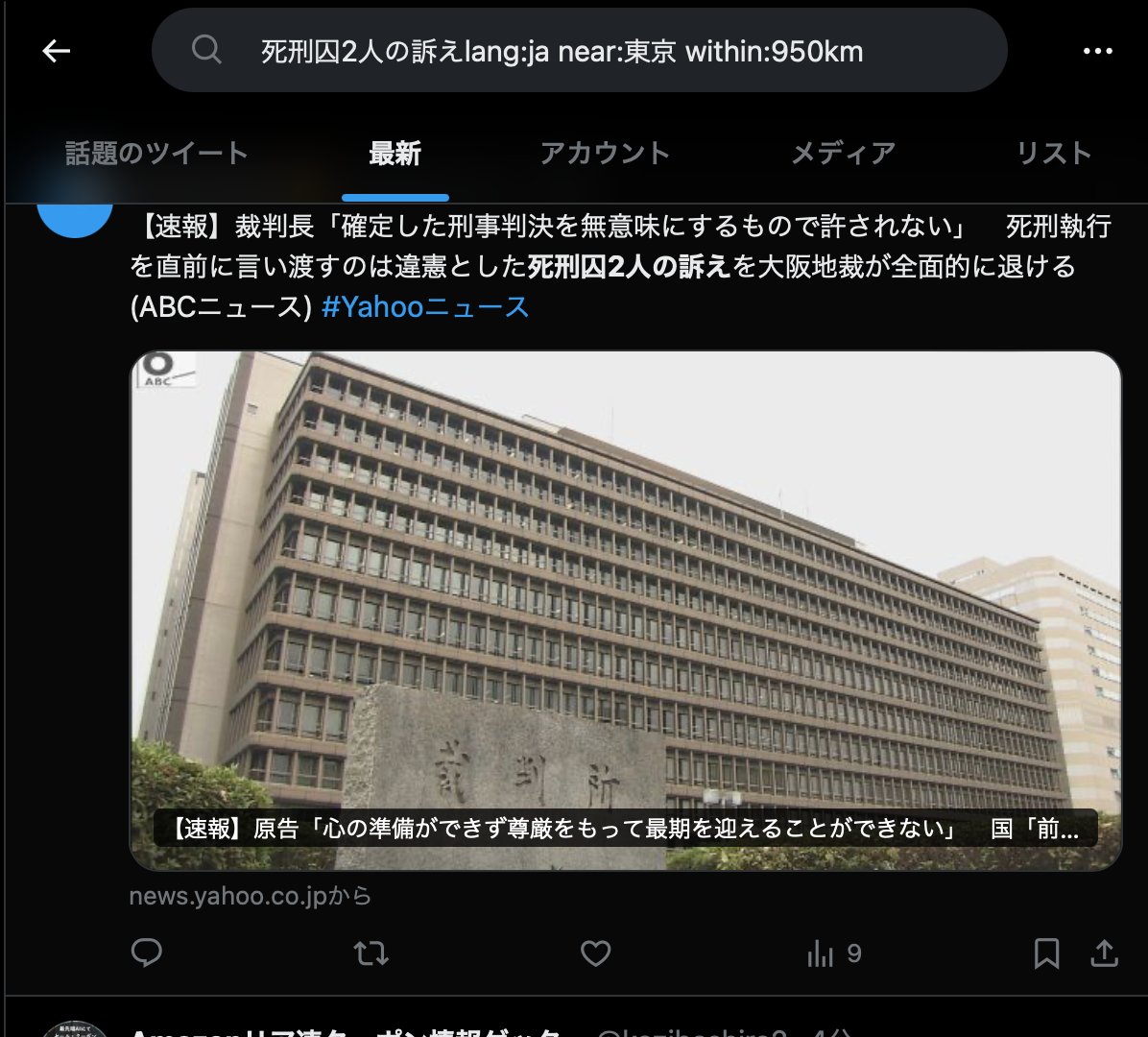 『インプレゾンビを一発で消す方法』見つけた。1、「lang:ja near:東京 within:950km」をつけて検索2、海外インプレゾンビがすべて消える。3、トレンド入りの理由がすぐわかる。鹿児島〜北海道が約1900kmだから半分の950km。#拡散希望 https://t.co/pPlrlCF7Rb