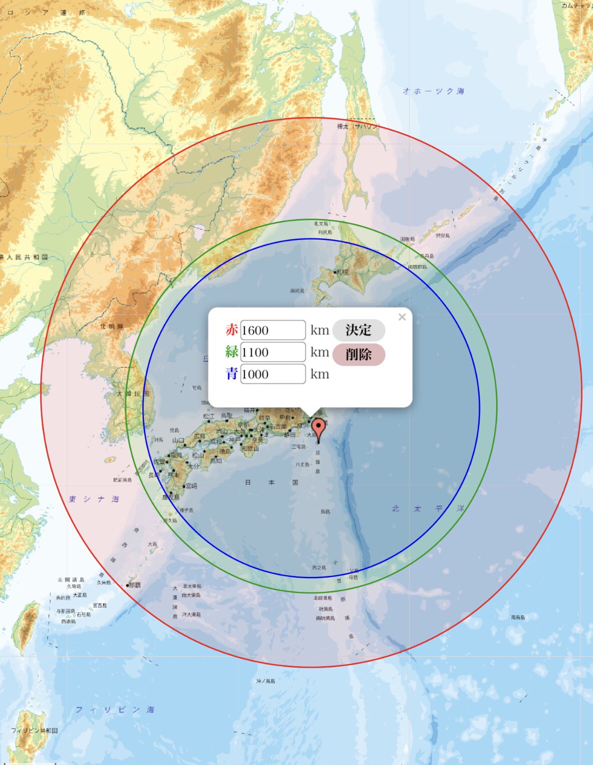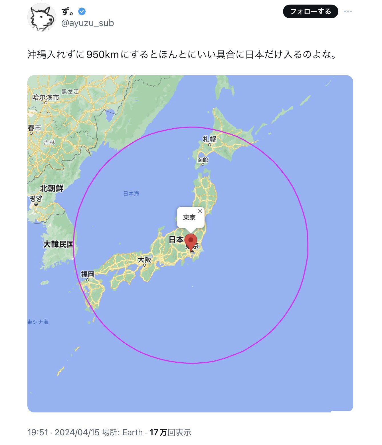 沖縄入れずに950kmにするとほんとにいい具合に日本だけ入るのよな。 https://t.co/zNgYaURMwr