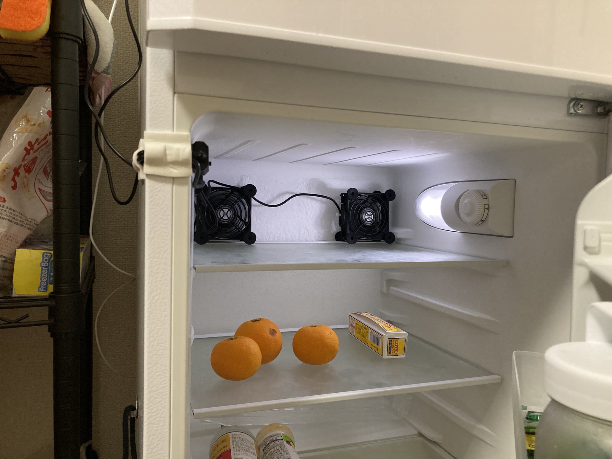 やっすい中古のHaierの冷蔵庫使ってんだけど、あんまり冷えないので強制対流させる為にファン設置した急にキンキンになり出してオモロい https://t.co/sHFanLUSe2