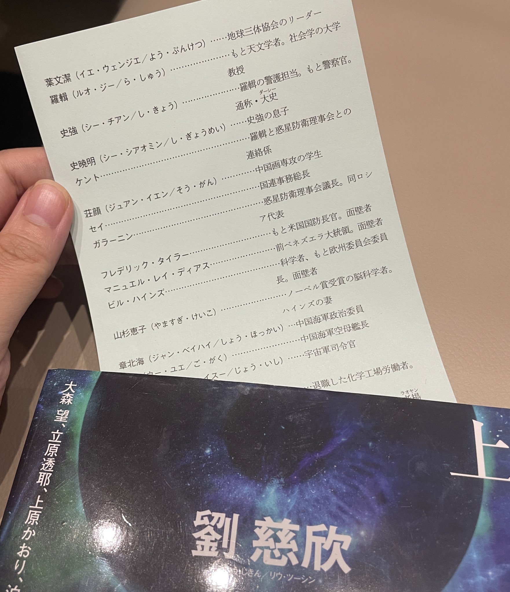 三体に登場人物が書かれた紙が入ってて、それを栞にしてる。ただでさえ名前覚えられないのに、外国名だともっと無理。