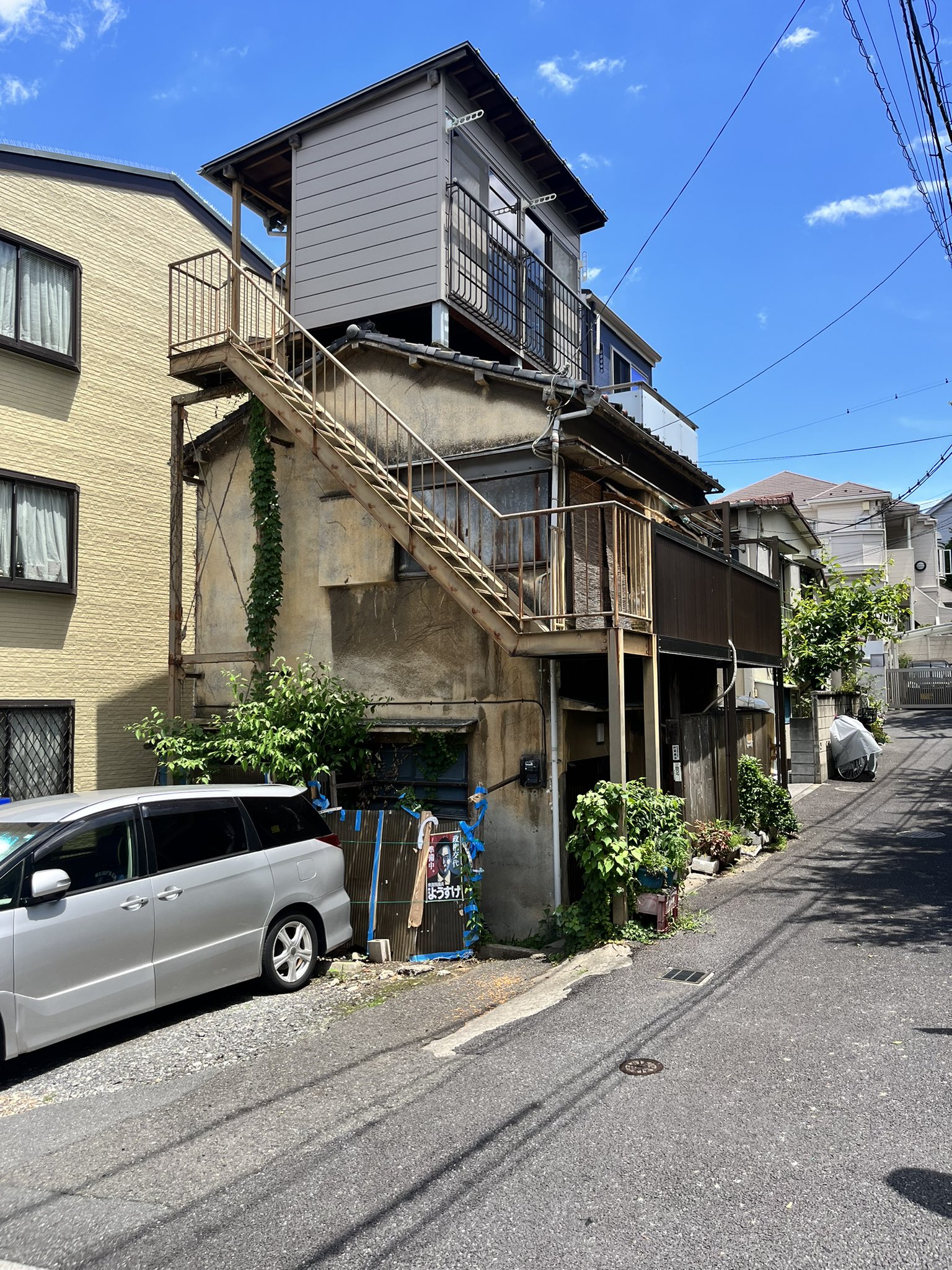 @hiroki_tominaga 裏の住居を見ると3階建てなので、恐らく第二種低層住居専用地域だと思いますが、施工会社が建築確認申請出していなければ、違法建築ですよね🤔2階ベランダを改造して作ったとみられる3階への外階段の古さ(サビている)と増築部分の新しさには違和感を感じます。ナゾです🤔