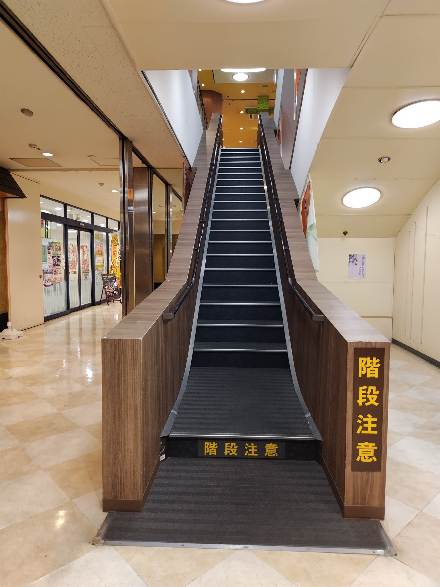 元エスカレーターの階段化事例か。登り口の段の高さを調整しているので、あとはステップの色を床面と同じような淡色にすれば違和感かなり軽減されそう。