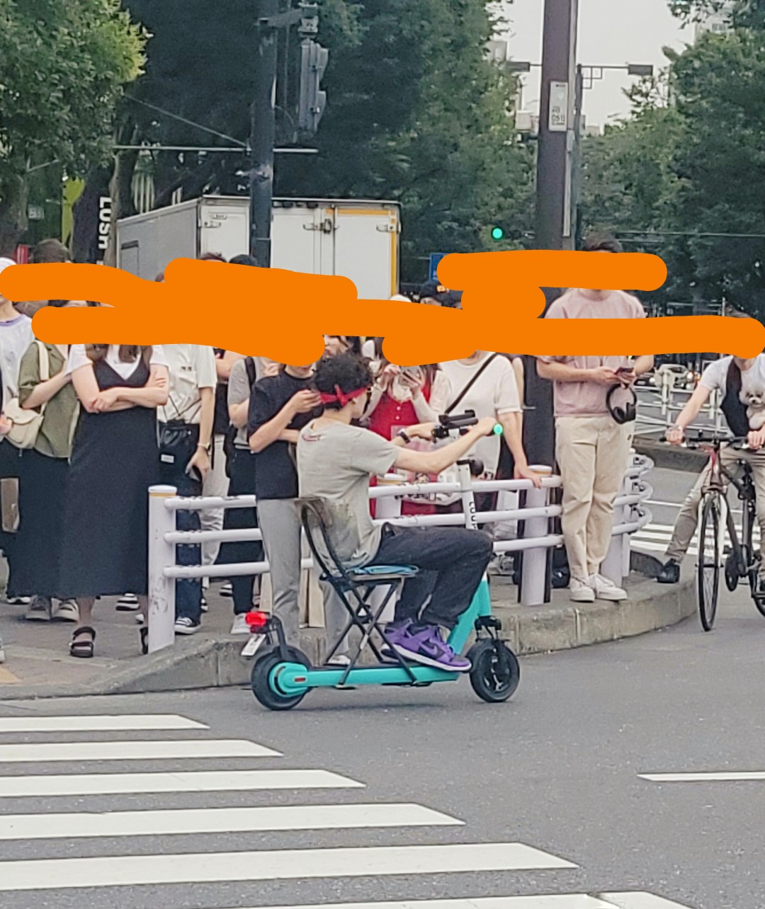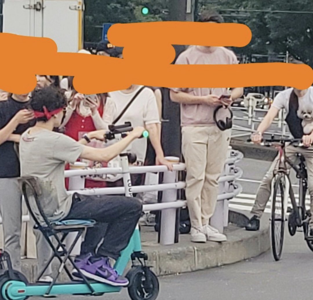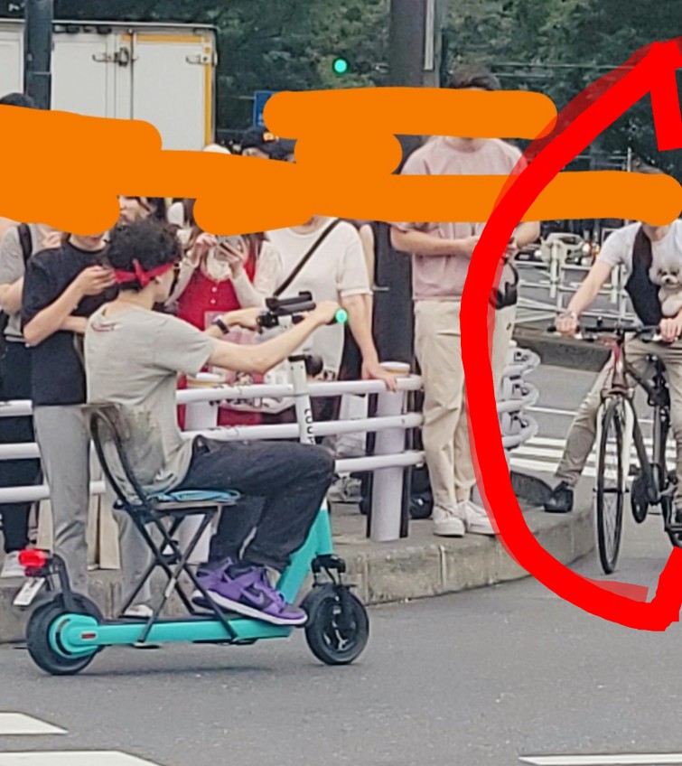 情報量が多すぎる・椅子・ヘルメット?ハチマキ?アフロ?・犬を抱えた自転車・というか逆走・我関せずの腕組仁王立ちネキ・人多すぎて溢れ出る歩道etc……