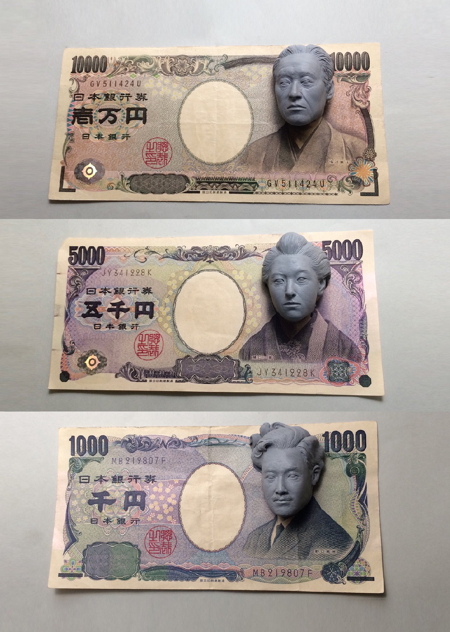 粘土で作ったお札のみなさんです。表面にハッチングを追加して完成しました。さみしくなります。 https://t.co/3FTiF2NatF