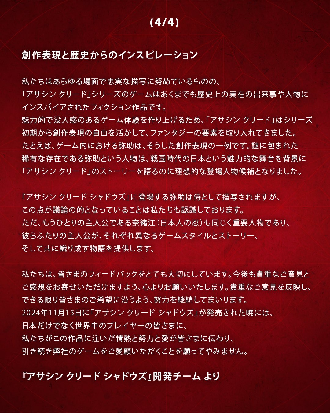 アサクリ問題についてUBIが声明を出した俺的感想中身の無い4コマ漫画読まされた気分※実際謝りつつフィクションやけん黙れと書いてあるくね?これは様々な批判は耳に入ってるが我々の方針はこれなのでよろしく。と方向転換する気はないと釘刺された気分だコメ欄見ると納得しました https://t.co/jcHRNQaevj