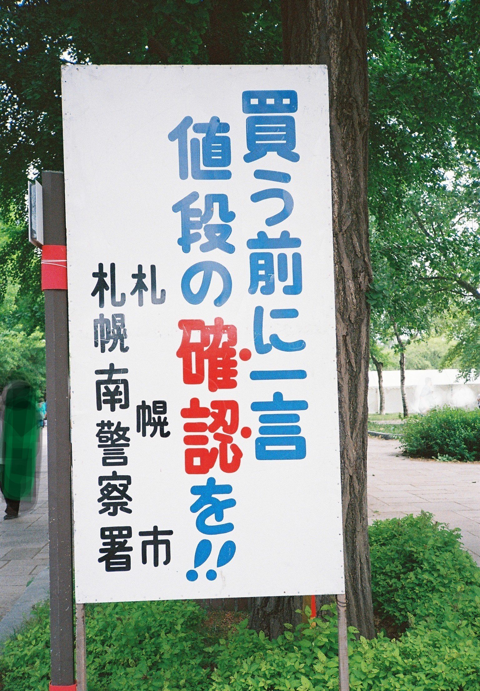 中島公園の入り口各所に「買う前に一言 値段の確認を!!!」って書かれてるのこう言うことかwwww値段の部分だけ赤字でどこの東南アジアかと…(タイで似たようなことがあった)