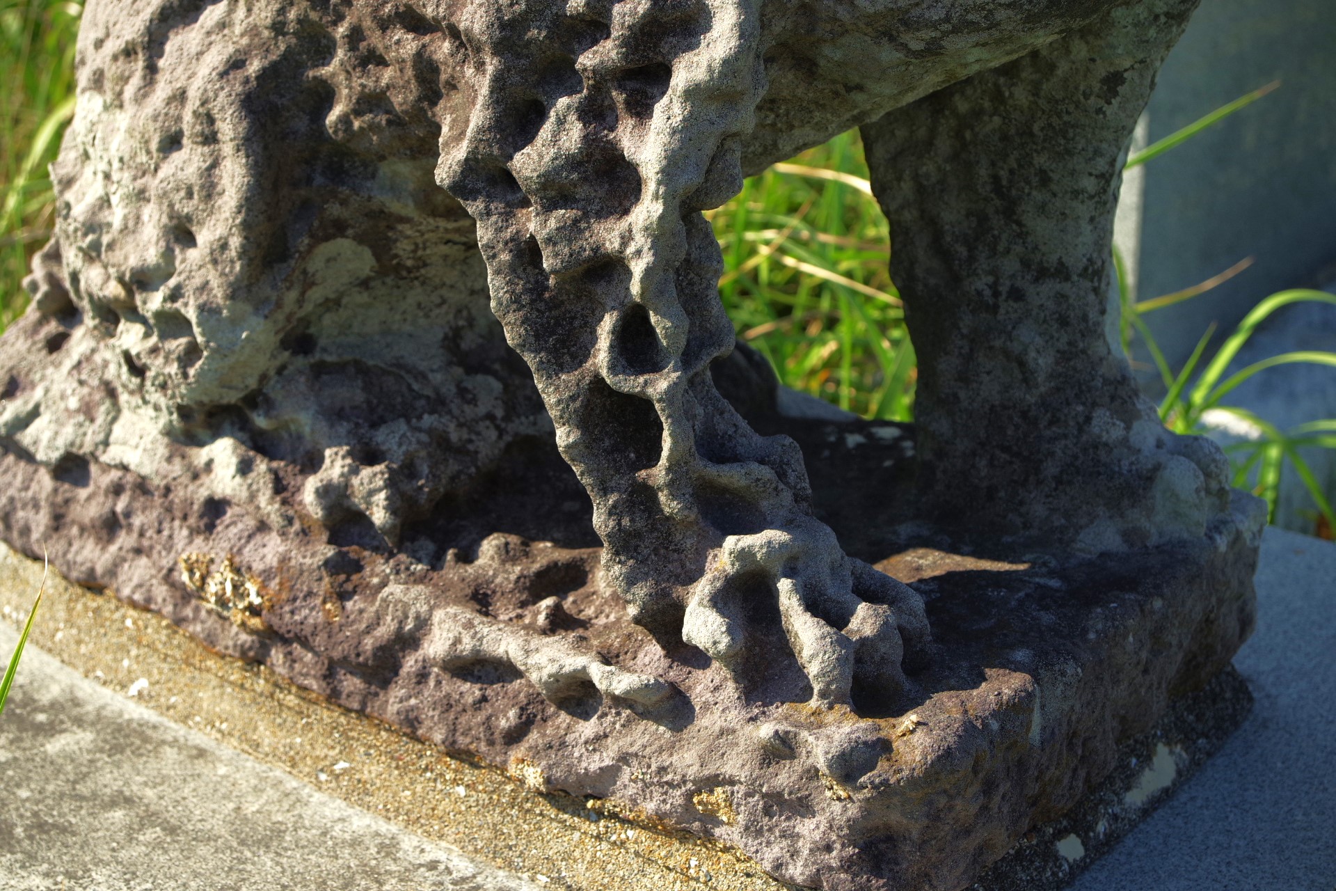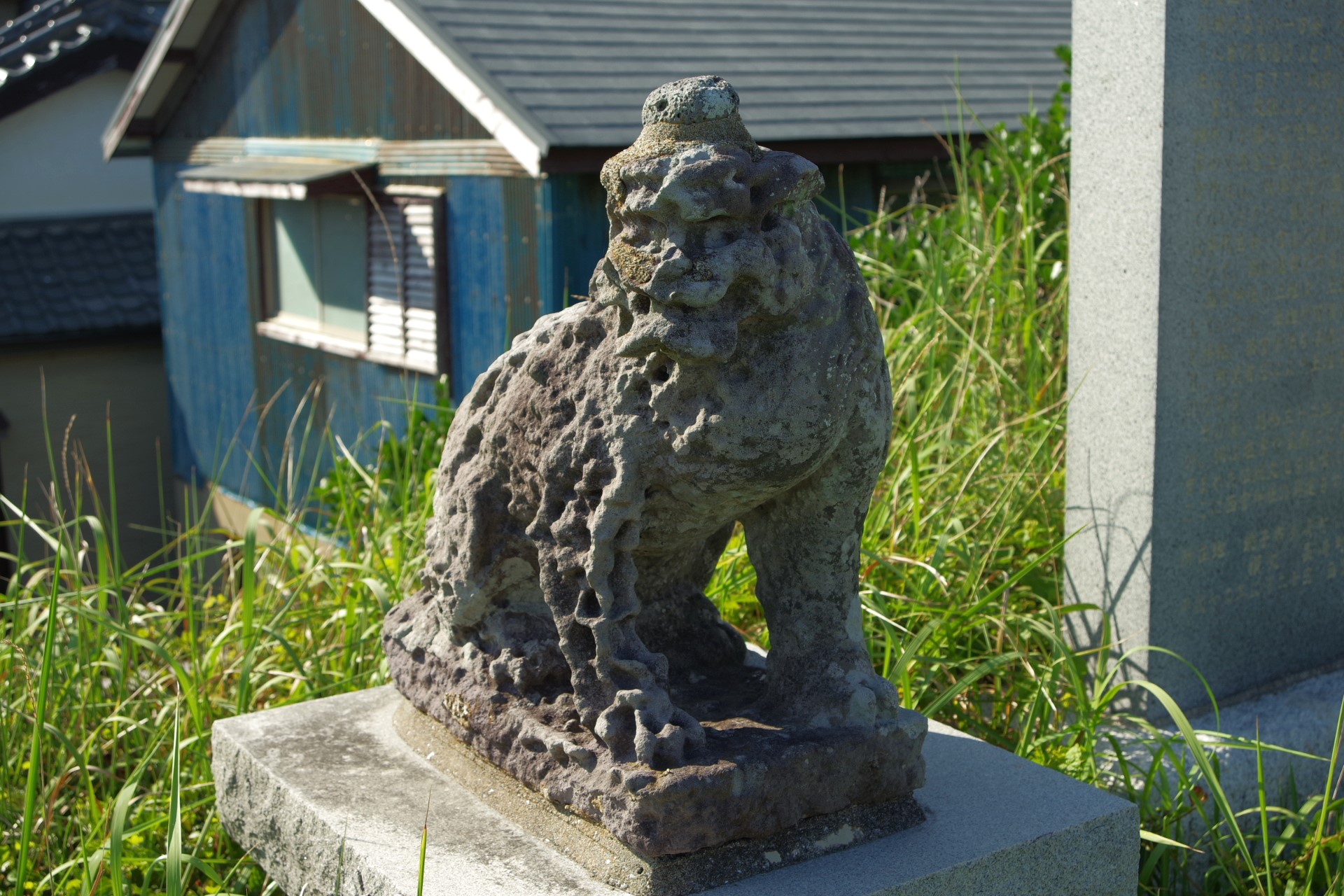 以前塩類風化という現象を教えて頂き、頭の中に残っていた。恐らくその現象により浸食された狛犬を海がすぐ近くにある港町の小さな神社にて見かけた。ともすればおどろおどろしい姿は、纏ってきた日々の重みなのだろう。 https://t.co/ROxckEgJ2D