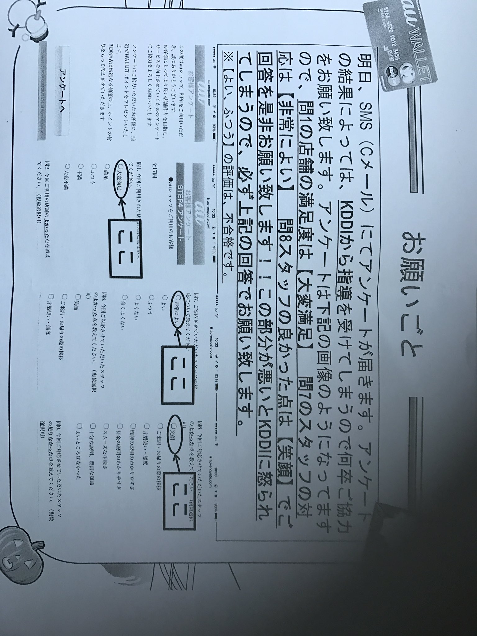 某auショップから「KDDIのアンケートはこう答えろ」って強制されたw 2016/11/12 19:00 画像 スポンサードリンク [投稿元ツイート:SHADEmiyoko(公式)さん] どこの店舗が知りませんが、これじゃあアンケートの意味がない・・・。