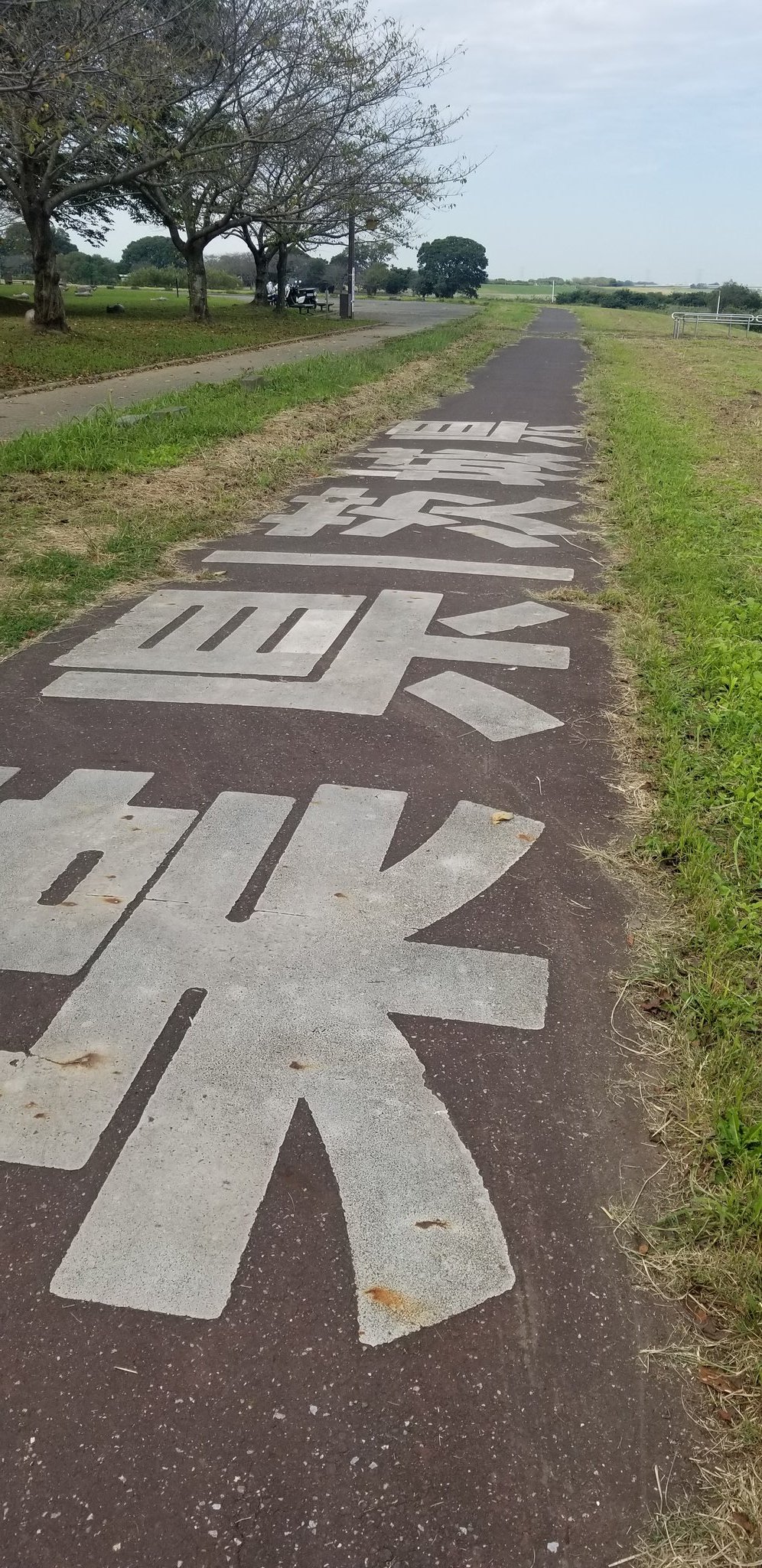 @102so @iroha_5700 関宿城博物館のうしろ 利根川堤防上に書いてある県境線です。鼻の先っぽが黒いのは他所の県なのを表しているのか? https://t.co/5dgQE1zUTt