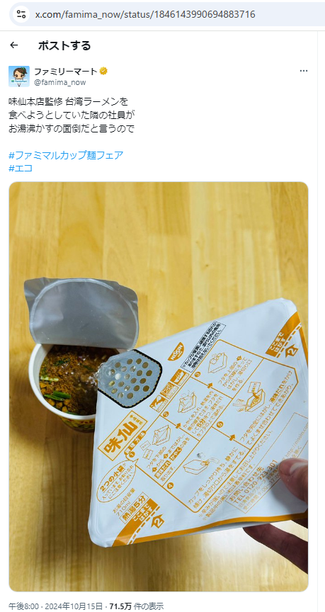 味仙本店監修 台湾ラーメンを食べようとしていた隣の社員がお湯沸かすの面倒だと言うので#ファミマルカップ麺フェア#エコ https://t.co/ewuEwyL5Dd