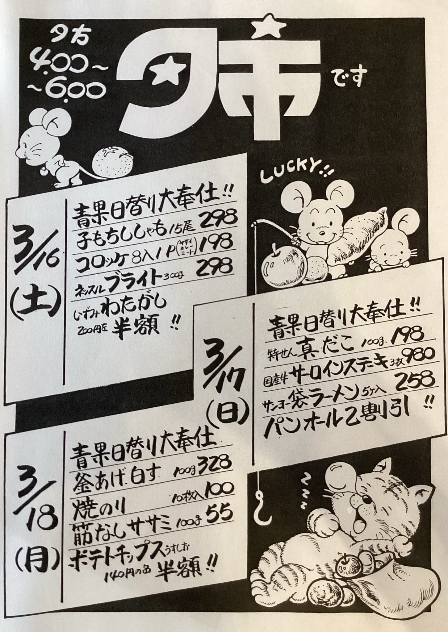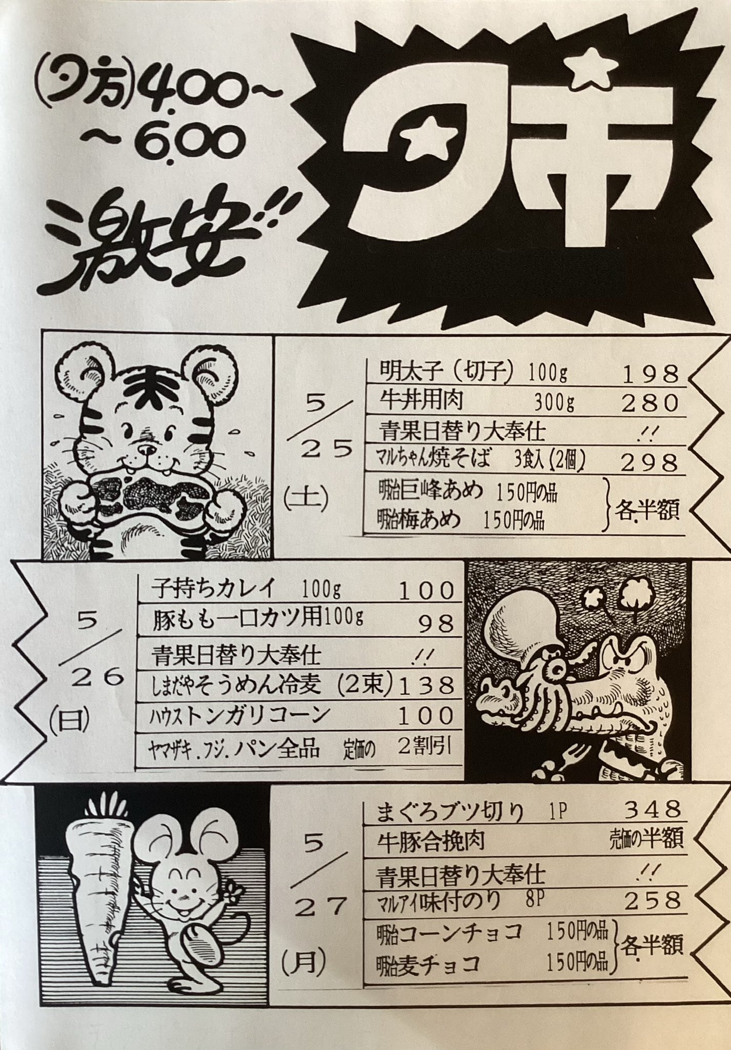 もっと見たいと言ってくださる方がいたので、こちら別の週のチラシです☺️ちなみに父はデザイナー的に働いていたのではなく、ここのスーパーの店長でした幼い頃から漫画家を志していましたが、あるきっかけで挫折これらは店長業務の合間で描いていたそうです https://t.co/98bPCJj1xy
