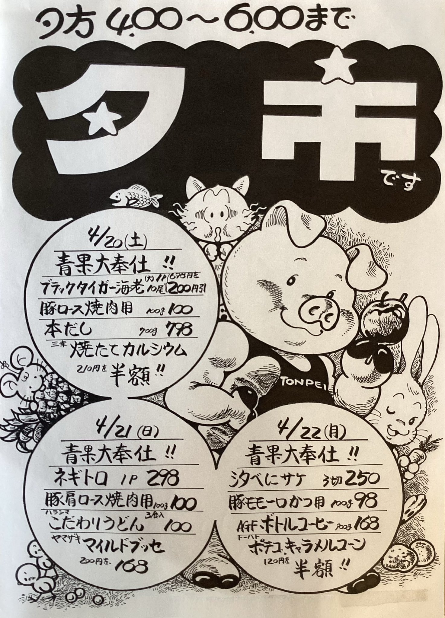 父親は昔、勤めていたスーパーマーケットのチラシを手描きで作ってたんだけど..その時の原稿が出てきたまんまるくてレトロかわいい夕市って言葉いいなぁ🥹 https://t.co/lkFCP7DUYu