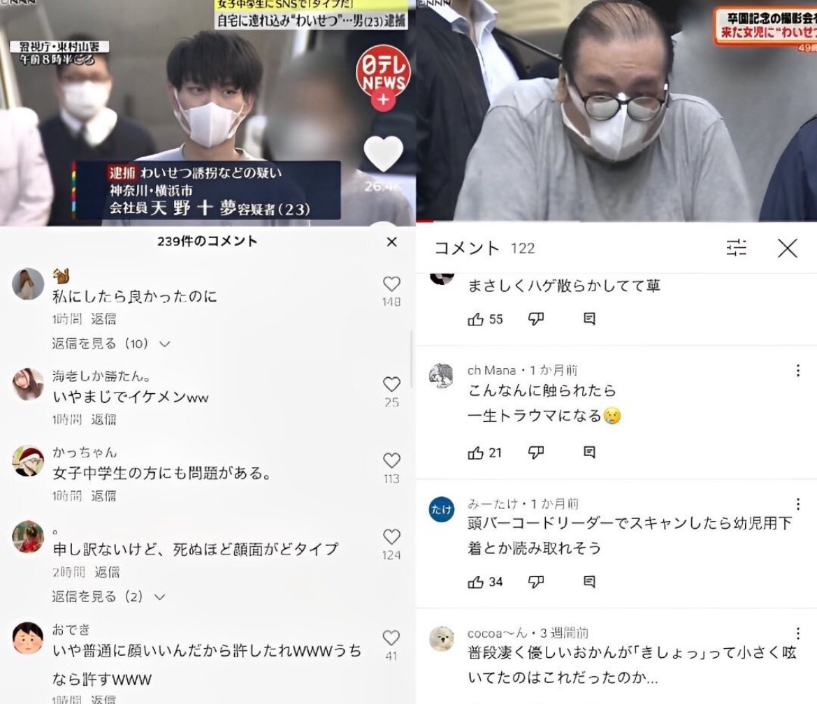 左の画像のようなコメントをする人は性別関係なく本当に何も言わないでほしい同じ人間と思いたく無い