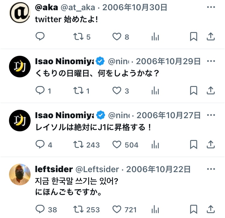 現存する最古の(非鍵垢)日本語ツイートは2006年で、IKKOの最初のツイート2008年より古いので誤りですね https://t.co/TtNnDyMrMu