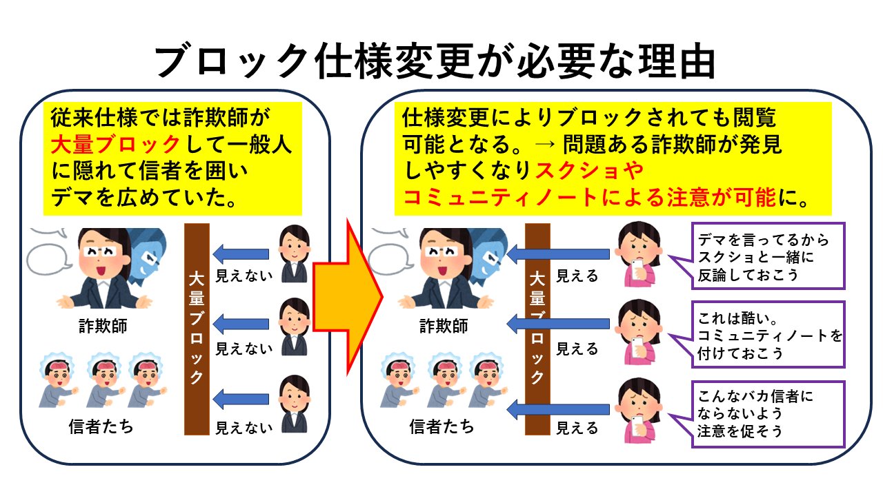 ブロックされたアカウントのポストが可視化することによってコミュニティノートが付けやすくなったり、誹謗中傷や罵詈雑言を浴びる内容のポストを通報しやすくなるといった利点もあるんですね。