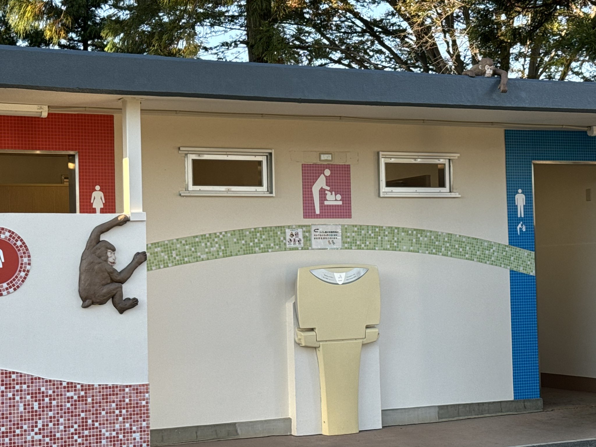 ワァーこれ動物園あるあるなのかな?私が赤ちゃん連れて行く動物園も似たような感じ…これよりも男子トイレ側に寄ってて通行人からは見えにくいけど、男子トイレ入る人には丸見え…使えるけど使えないんだ