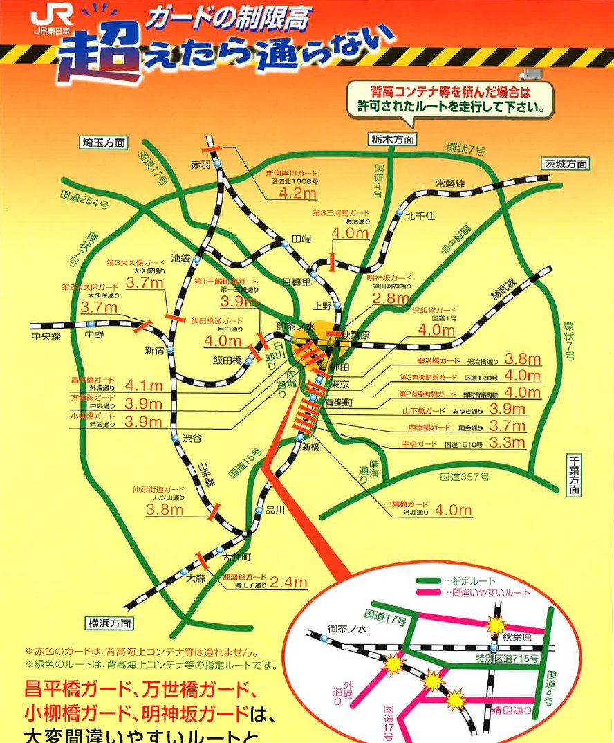 @akmqb 秋葉原のあたりは、線路下に入るかなり手前から路面がアンダーパスで下がる僅かな場所以外はトラックが引っかかってしまう確率の方が高い。手抜きなショートカットをしないで上野駅の南側か、総武線のお茶の水よりのガード下など、確実に余裕があるところ以外通らないくらいの覚悟をしないとダメ。