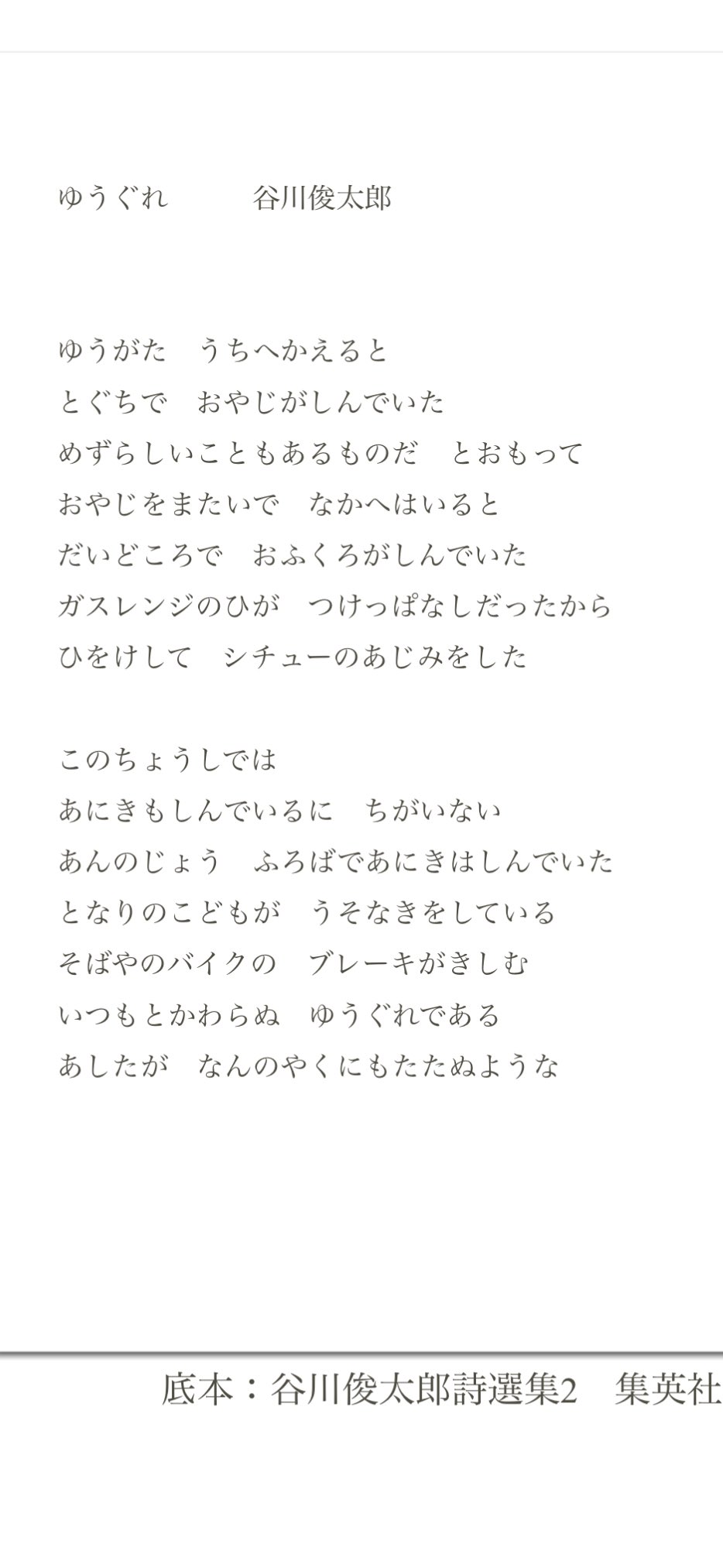 谷川俊太郎氏の名作は数知れないけど、私が一番好きなのは「死んだ男の残したものは」だよ。今のこの世界にこそ語り継がれるべき詩だと思う。 https://t.co/CG0MJpjW6C