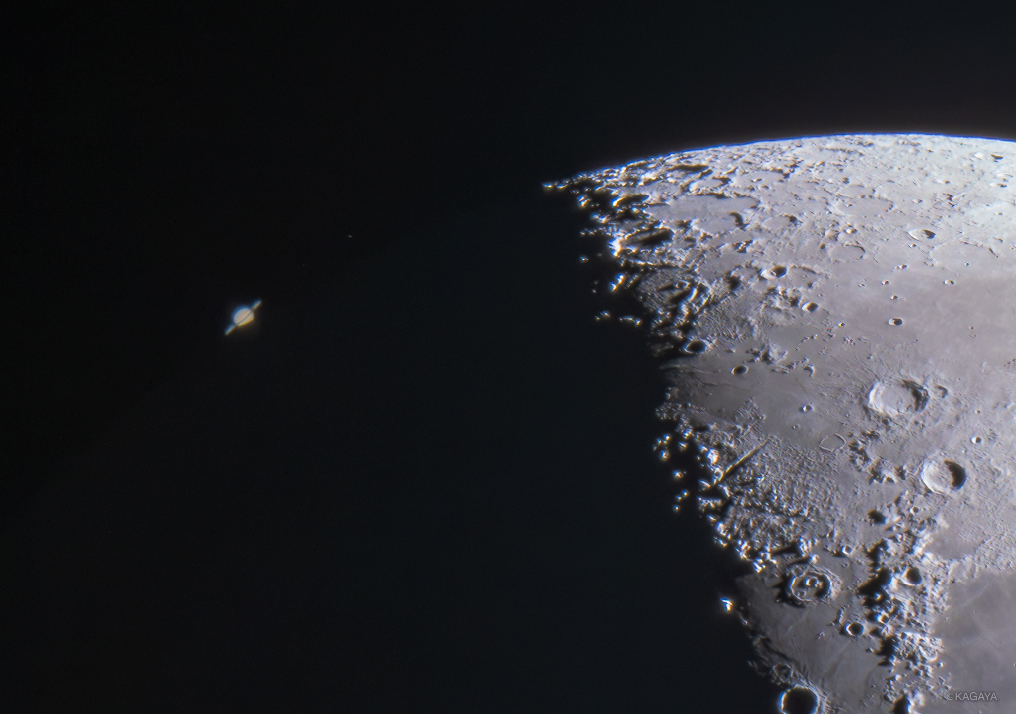 さきほど望遠鏡を使って撮影した、月に土星が隠される土星食の瞬間です。土星の右上に写っている小さな星は土星の衛星のタイタンです。 https://t.co/nZ2qyWZyit