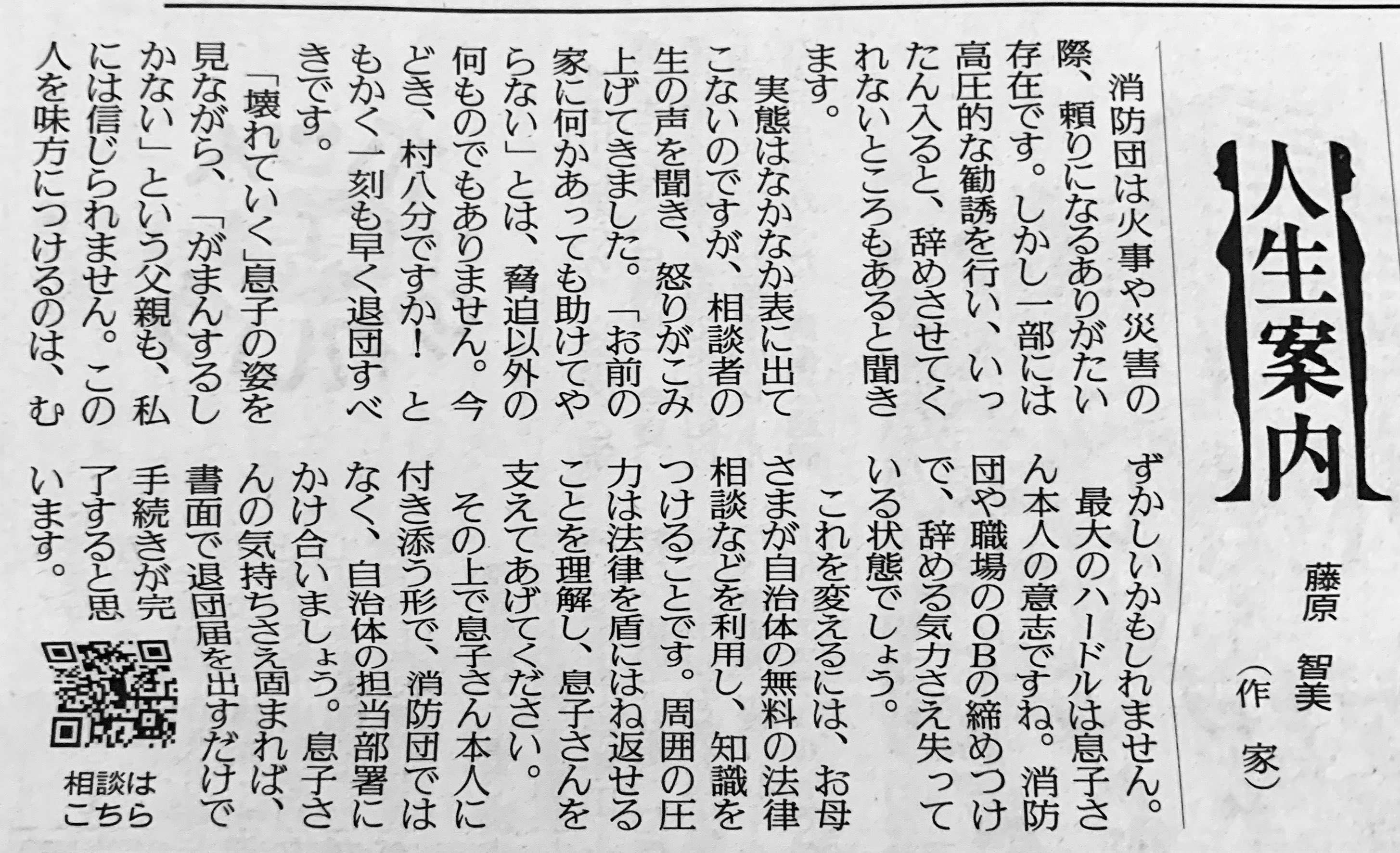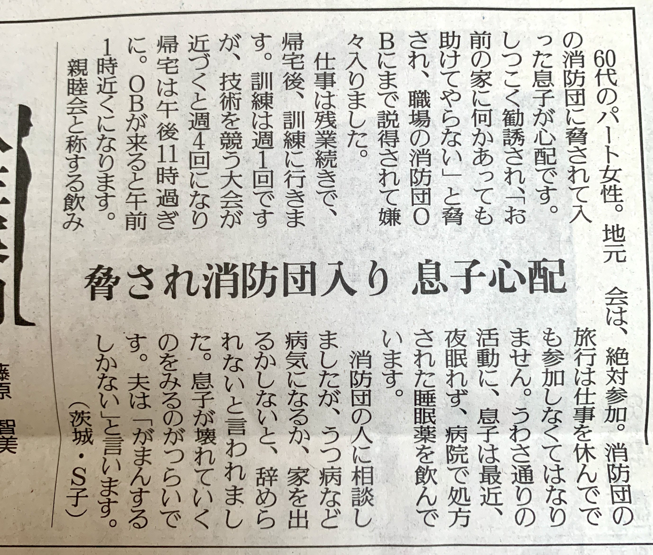 今朝の新聞の相談欄。酷いね、これ。地域の消防団活動のパワハラじみた活動は聞いたことあるけど未だにこんなことまかり通ってるの?#消防団 https://t.co/axzY7qQxHL