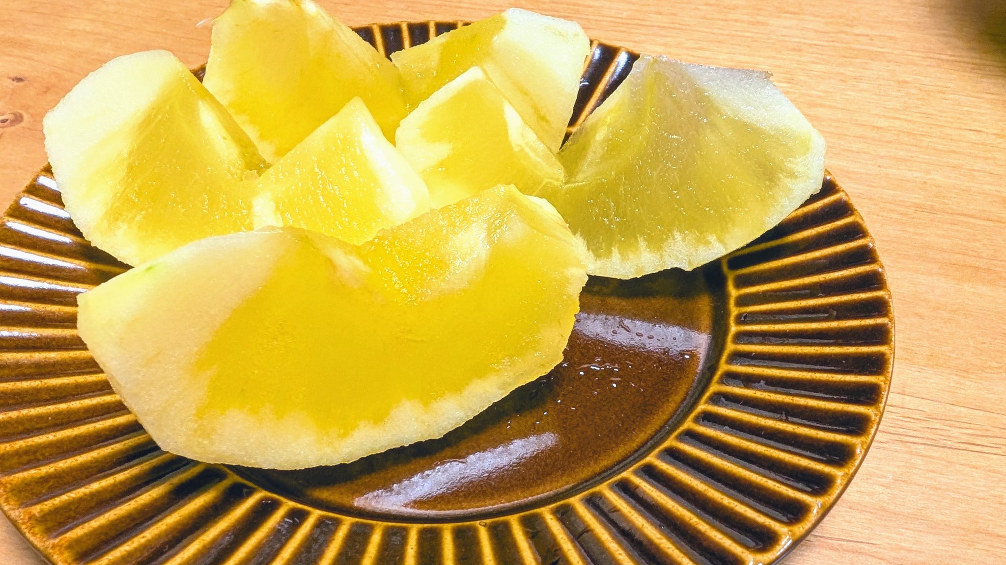【食感は?】食感はやや柔らかいもののシャリっとした食感は残っています。【風味は?】風味はりんごというよりもパイナップルに近い風味でした🍍これが一番面白いなと思ったところです。