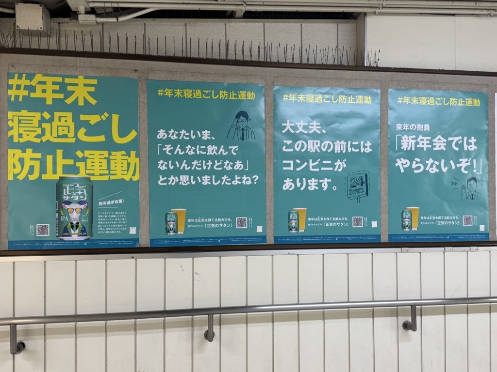 これか…南栗橋以外にも国府津、高尾(JR)、小金井、森林公園、拝島(西武)、京成佐倉都心からの終着駅7駅にポスター掲示ね飲酒機会の増える忘年会シーズンに「終着駅」で適正飲酒呼びかける『#年末寝過ごし防止運動』始動 【Alc.0.7%微アル飲料「正気のサタン」】 https://t.co/19i8A0RUCc