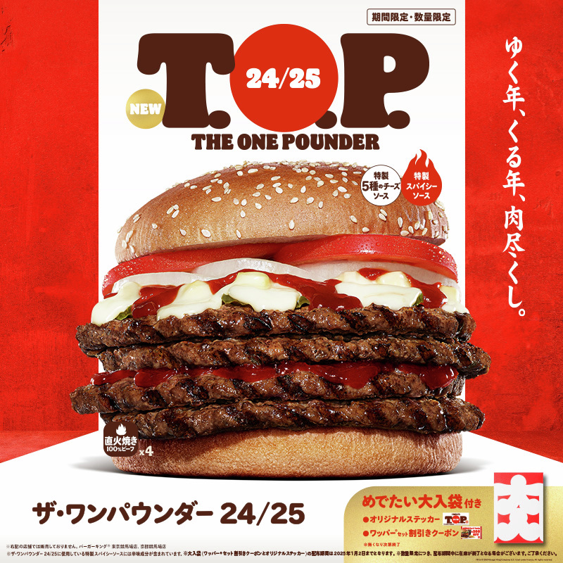 『24/25 T.O.P.(ザ・ワンパウンダー 24/25)』本日新発売!直火焼きの100%ビーフパティ4枚にピリ辛の「特製スパイシーソース」と、まろやかな「特製5種のチーズソース」で仕上げた紅白カラーの超大型チーズバーガーです!今年最後のワンパウンダーをぜひお楽しみください!#バーガーキング https://t.co/llqMFRTAjt