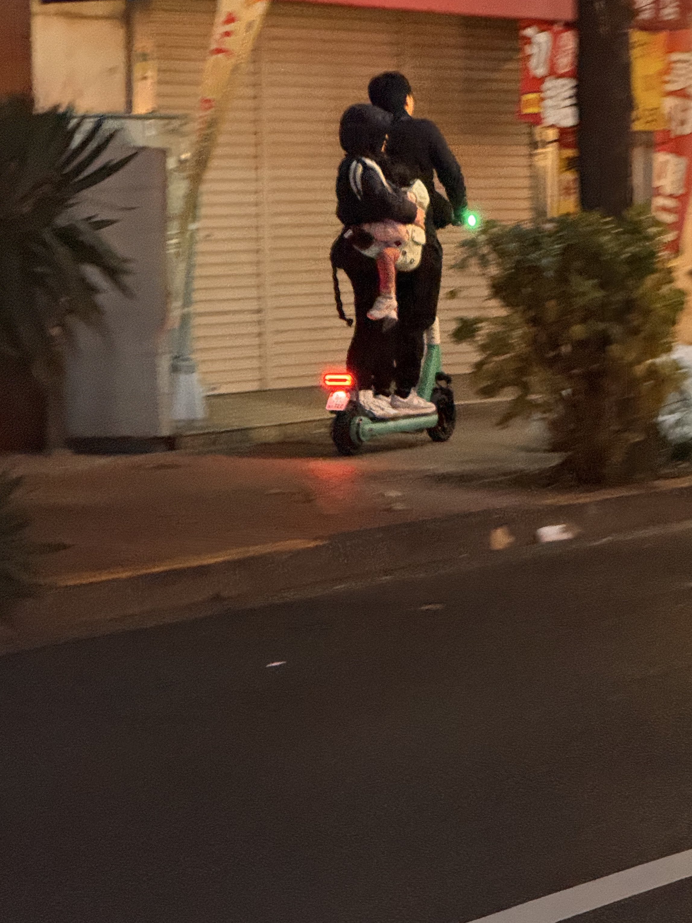@cho_roki もう、昭和の頃の自転車の2人乗りのほうがまだコレよりはマシだったのでは?電動なんてなかったから、2人分は重くてスピードも大して出なかったでしょう?昔のほうが長閑で安全だったなんて、文明が退化してると思う。安心してぽけ〜っと歩ける国にして欲しい。あと、ご飯を安くして、、😅