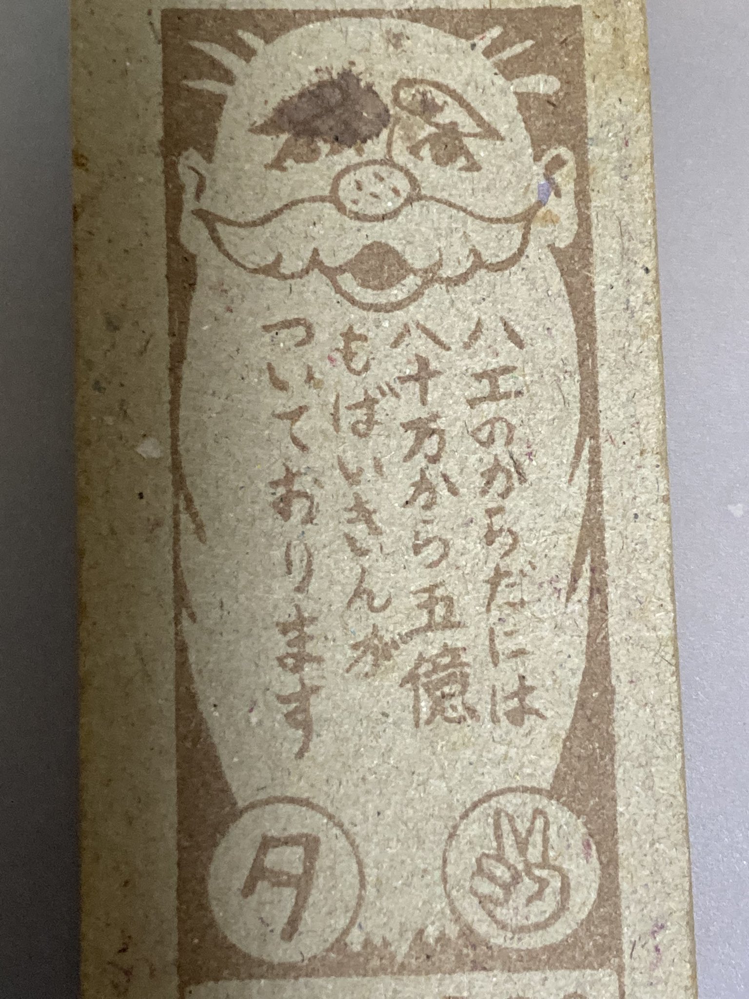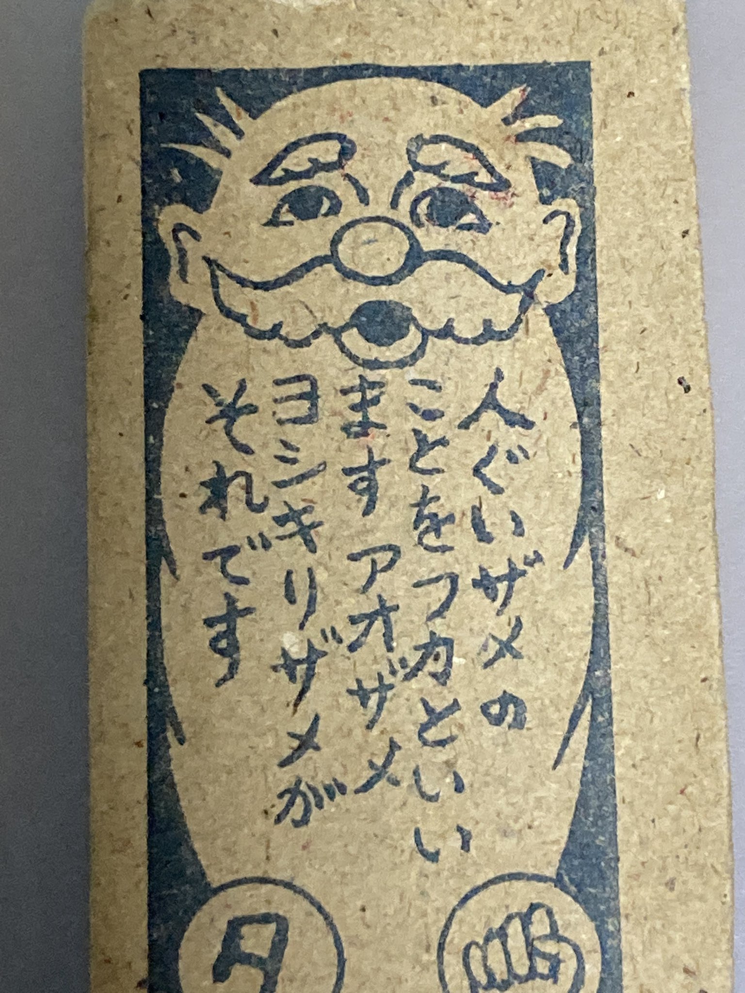 メンコの裏。薄気味の悪い知識を、丁寧な言葉を使って顎ひげで伝えるという異様なことをしている謎の老人。その虚ろな目が好きです。 https://t.co/hB3xwQ1Em1