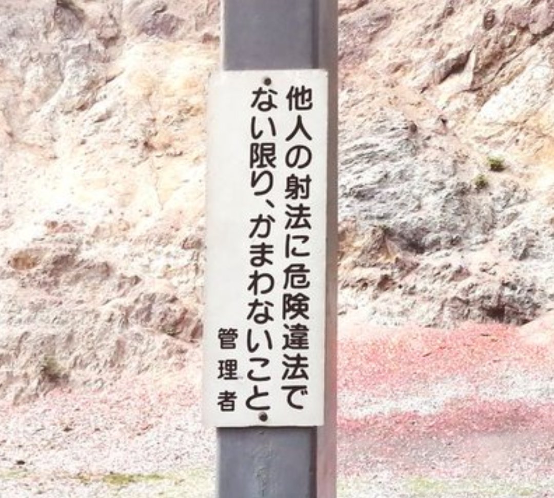 なんだか人気なので補足この写真の注意書きは京都にある京北綜合射撃場のアメリカントラップの射台の柱に掲示されています。後ろの観戦席から見ると撃っている人と並んで見える位置なので、内容だけでなく設置場所も絶妙な名物看板です。 https://t.co/NeMqFlYrB3