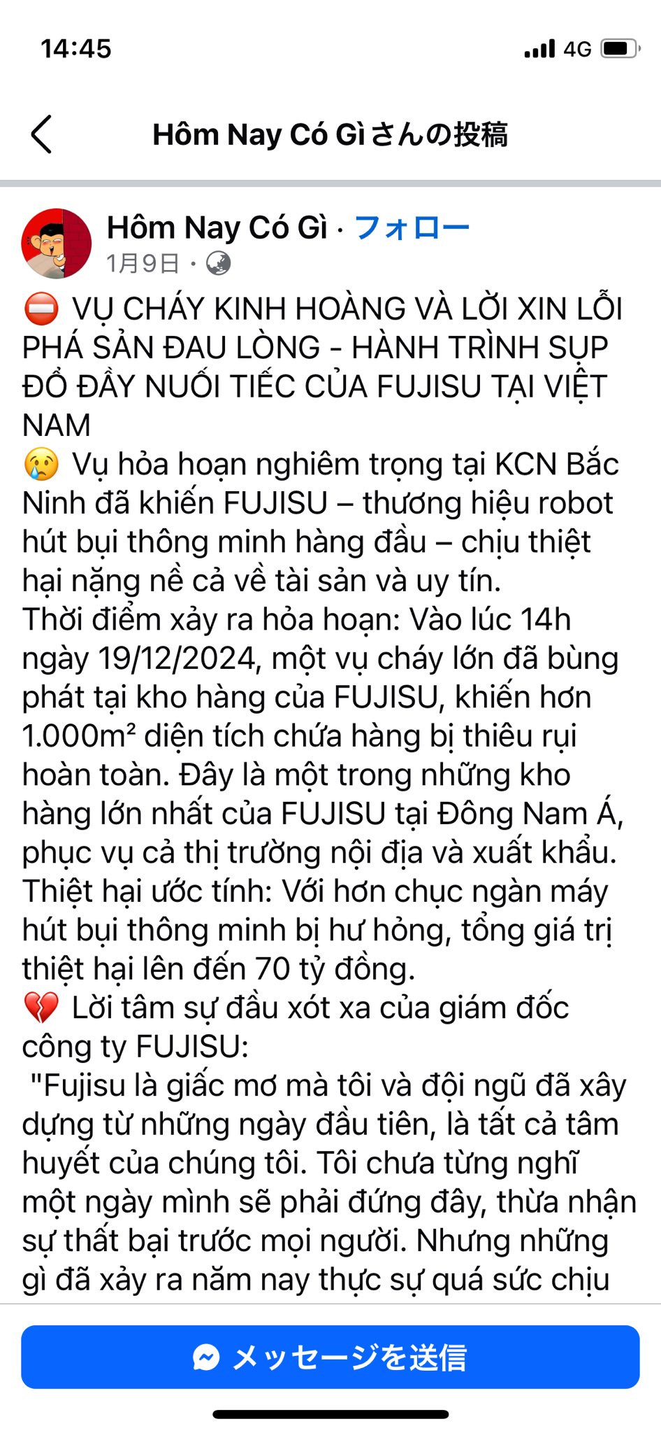 反響あったと妻に話すと「実はそれだけじゃないの!」と。FB上で「FUJISU社バクニン倉庫大火災、被害甚大でベトナム市場撤退、涙の在庫一掃セール、買って支援を!」との投稿見てのこと。そんな火事のニュースは勿論無い。「FUJISU社」サイトは既にアクセス不可。酷い手法だ…https://t.co/4NEmnFtJEu https://t.co/uF4FEfi0eb